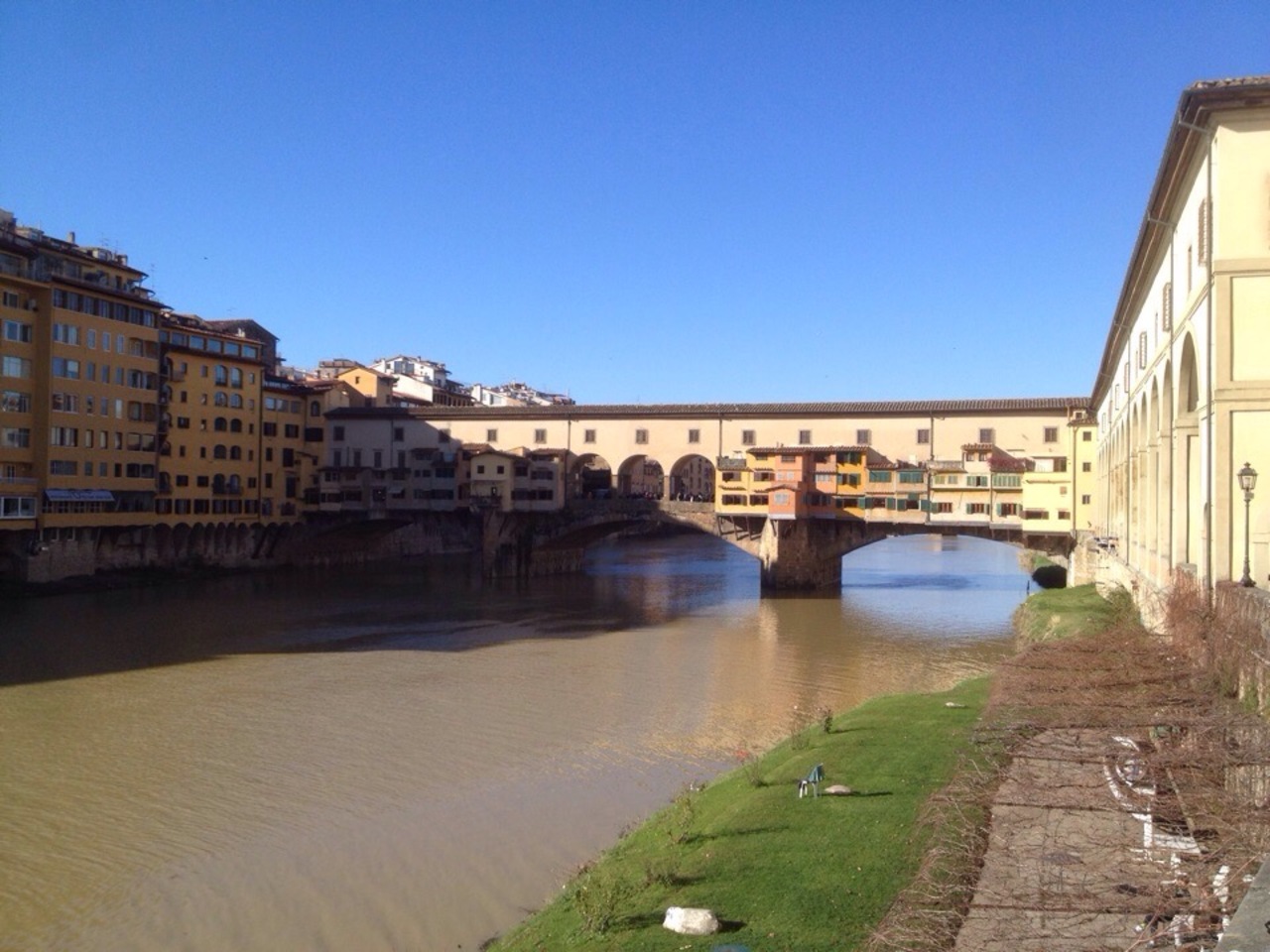 アルノ川にかかるフィレンツェ最古の橋、ポンテ・ベッキオ。多くの人で賑わっており、橋の両側にはずらりと宝石店が並んでいます。高価な品が多く手が出せませんが、見るだけでも楽しめます。お店の上は、ウッフィツィ美術館へ続くヴァザーリの回廊となっています。
