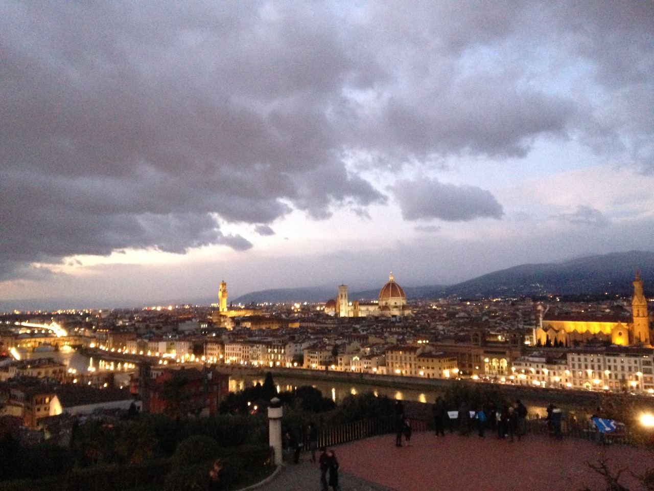 市内中心部から歩いて行きました。アルノ川を越えて20分ほどで着きますが、丘の上へ昇っていく階段が少しキツいです。広場は混んでいますが、フィレンツェに来たら絶対に行くべき場所です。夕暮れから暗くなるまで広場にいましたが、徐々に暗くなり街に少しずつ明かりが灯っていく景色が幻想的で美しく、忘れられない光景です。