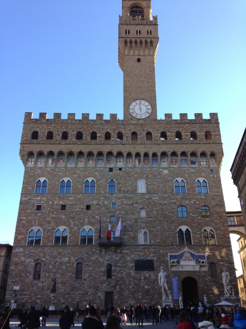 要塞を思わせるロマネスク様式の宮殿。今でも市庁舎として使われています。シニョリーア広場に面していて、正面脇にはミケランジェロのダビデ像のレプリカがあり、隣のロッジア・ディ・ランツィには複数の彫像が展示されています。