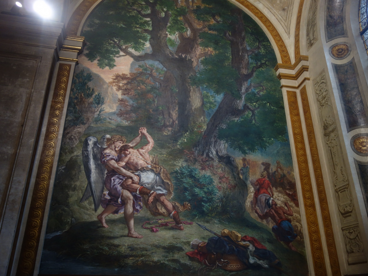 ダン・ブラウンの小説に影響されて「子午線」に眼がいくかもしれませんが,この教会の最大のアトラクションはドラクロアのフレスコ画です。玉枝のほうの右手にあります。高いところなので首が疲れるかもしてません。これを見たあとに,ドラクロア美術館に行って,ドラクロアのことをいろいろと考えるのもよいでしょう。美術館はすぐそばです。