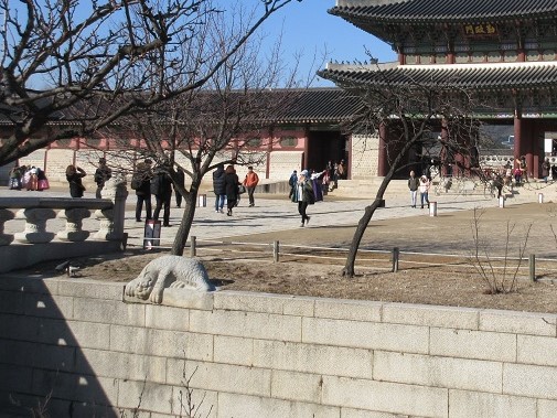 ソウルの代表する観光スポット景福宮に入ってすぐ、勤政門へと向かうルートに、珍獣の彫像が施された石橋がこの橋です。他のソウルの古宮や、中国の紫禁城などにも同じような川と石橋があるので、風水の関係でこうした設計がされているのかもしれません。そのようなことに興味を持ちながら橋を渡りました。