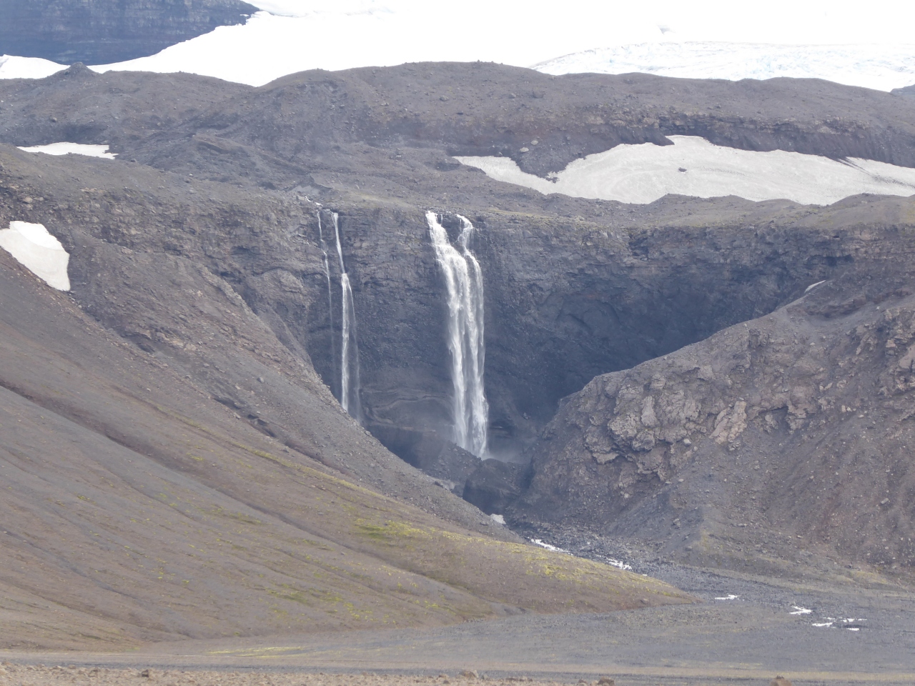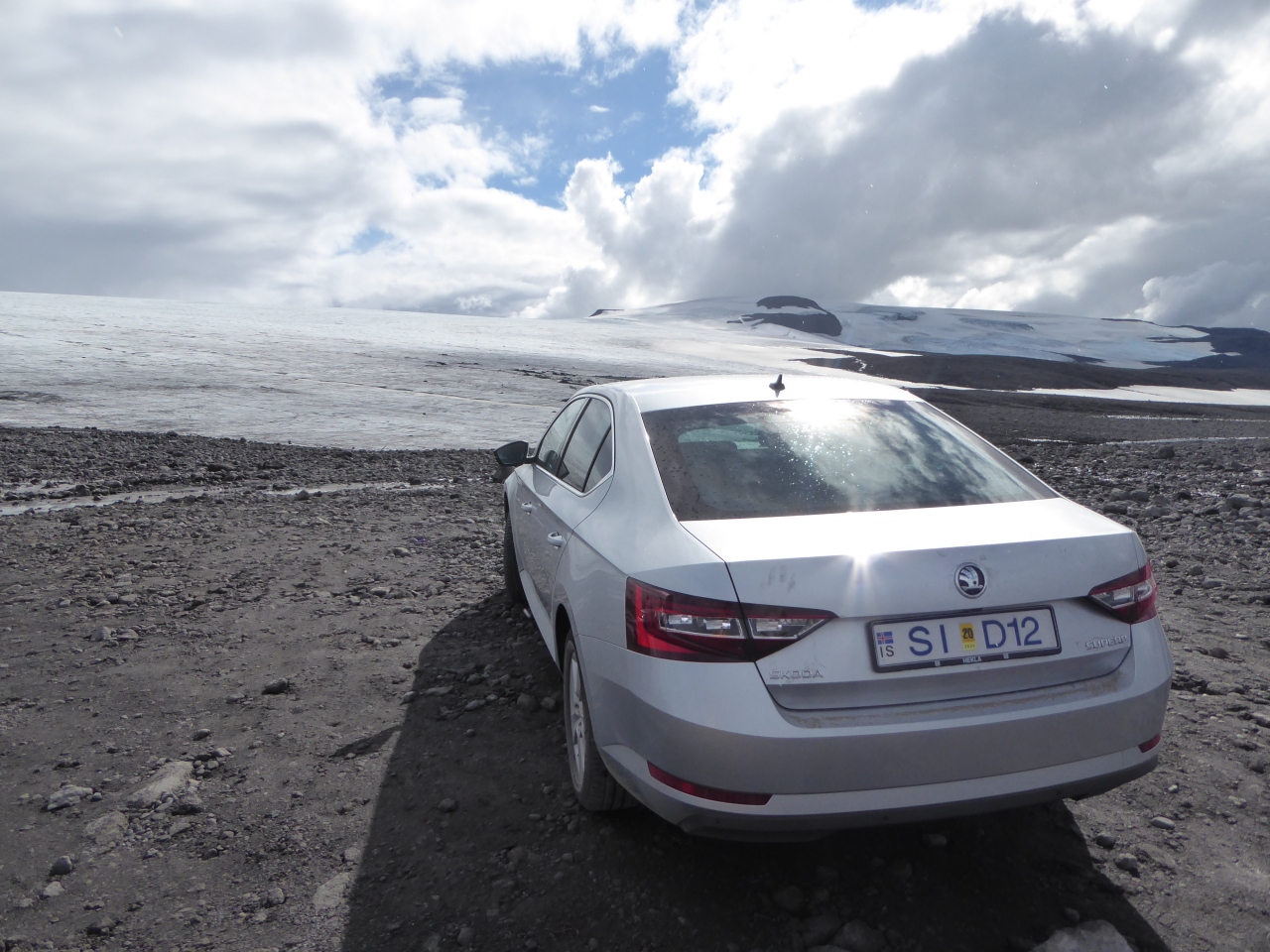 レイクホルト(Reykholt)から518号線を東に進むと、未舗装道路(F550号線)がありました。数字の前にFが付く道路は、通常、4WD専用道路です。しかしながら、普通車の対向車を結構見ましたので行ける所まで行ってみることにしました。自己責任リスクを承知での前進です。どんどん進むと、道路が氷河で行き止まりになっていました。ラングヨークトル氷河で、雪上車が氷雪上に停車していました。この場所まで、レイクホルトから2時間程要したように思います。