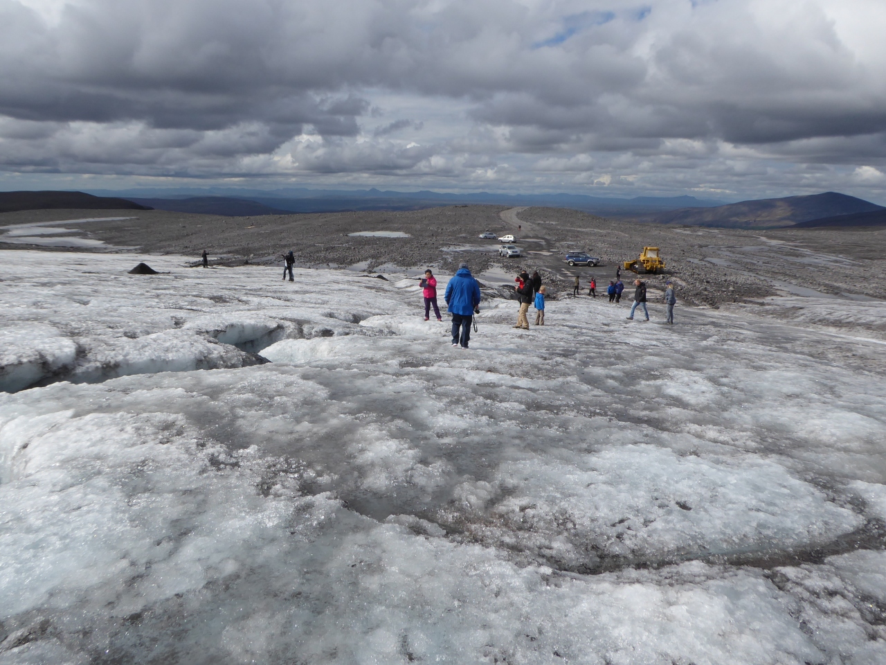 行き止まりの道路上には車が数台駐車しており、氷河上にも人影が見えました。行って見ることにしました。泥濘を注意して進むと、氷河上に到着しました。ザラメ状の引き締まった氷で、解けた氷水が脇で水路になって流れています。雄大な景観です。