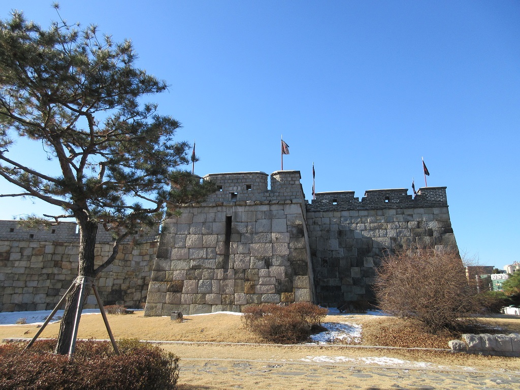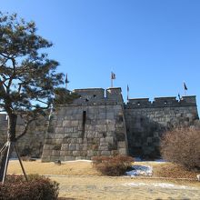 華虹門から長安門に向かって城壁をすすんでいった際に、そとに向かって飛び出したような構造の砲台が作られていました。他にも同じような構造の物が何か所があるようですが、壁の一部が切れ込みが入った構造など、ヨーロッパや中国の城壁とよく似ており興味をひかれました。