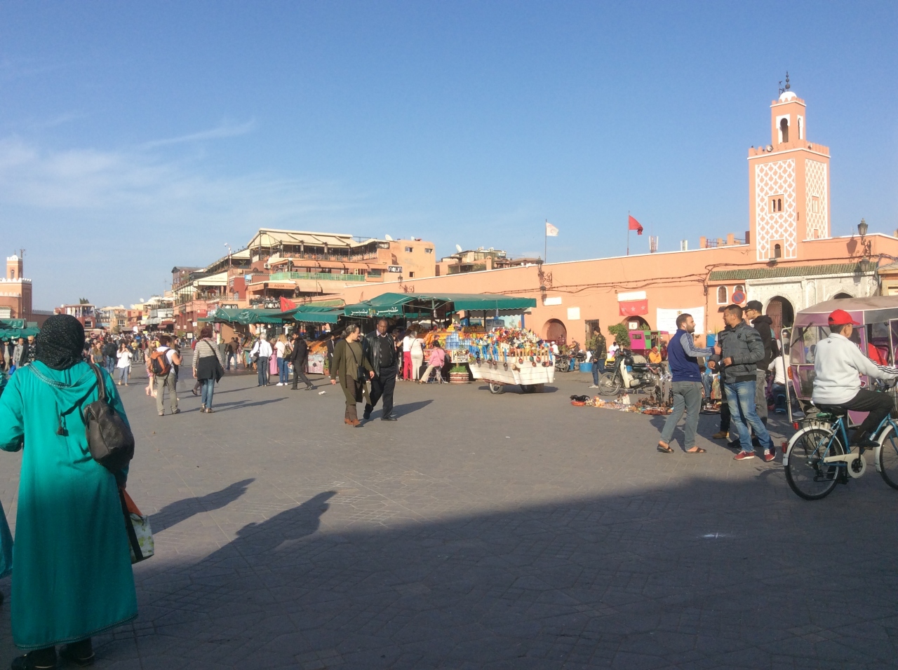 モロッコ周遊旅行の最終日にマラケシュで観光しました。メディナの外れでランチしスーク(市場)をぶらぶらしながらジャマ・エル・フナ広場に行きましたが、突如多勢の観光客や大道芸人で大賑わいのフナ広場にビックリ、平日の午後なのに多勢の観光客がそれぞれ楽しそうです。