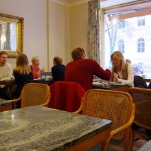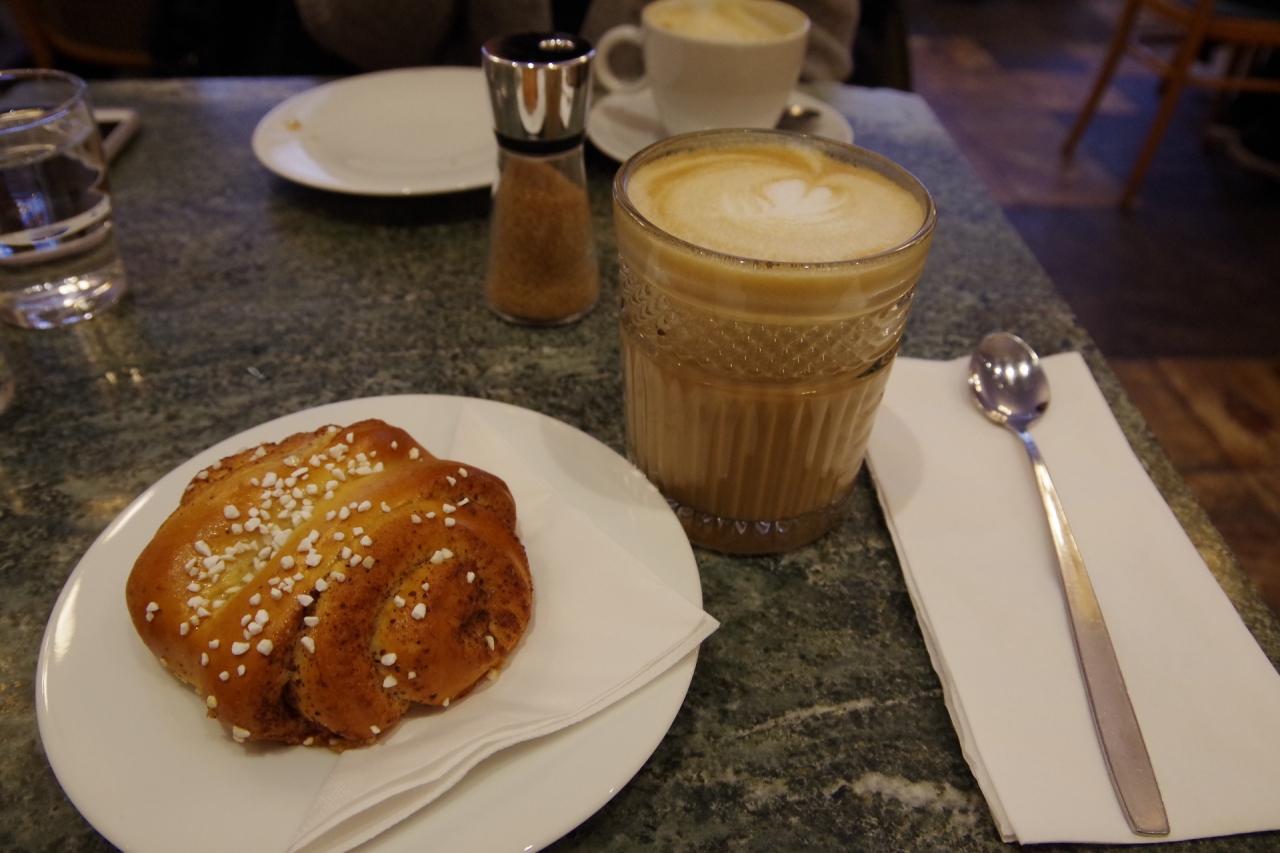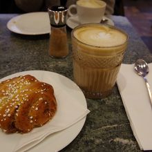 店内は地元の人たちや観光客で朝から混み合っていて、朝食ビュッフェを食べてる人が多かったです。 私たちは敢えてラテとシナモンロールのみを注文。 もう少し期待していたのですが、前日の残り物?と思ってしまうようなパサパサ感の強いシナモンロールでした…。 ラテは美味しかったけれど。
