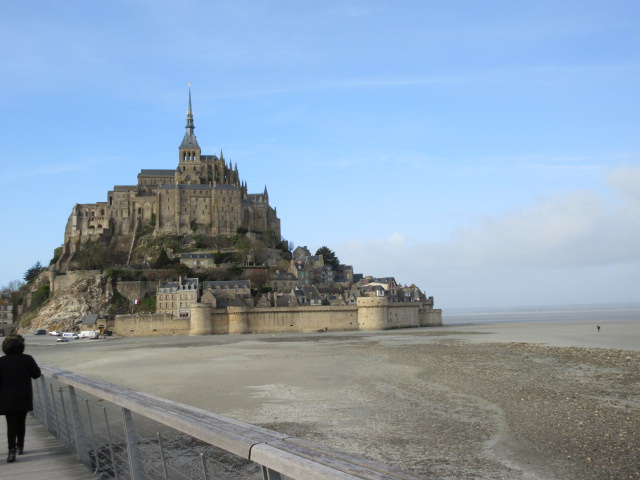 モンサンミッシェル島の周りの海は潮の満ち引きが見られて興味深いです。干潟を歩く人もいましたが、粘土質のようです。危ないので、個人では歩かないように、との事。歩くツアーもあるそうです。海と島と建物のコントラストが素敵で日本人に人気の観光地です。