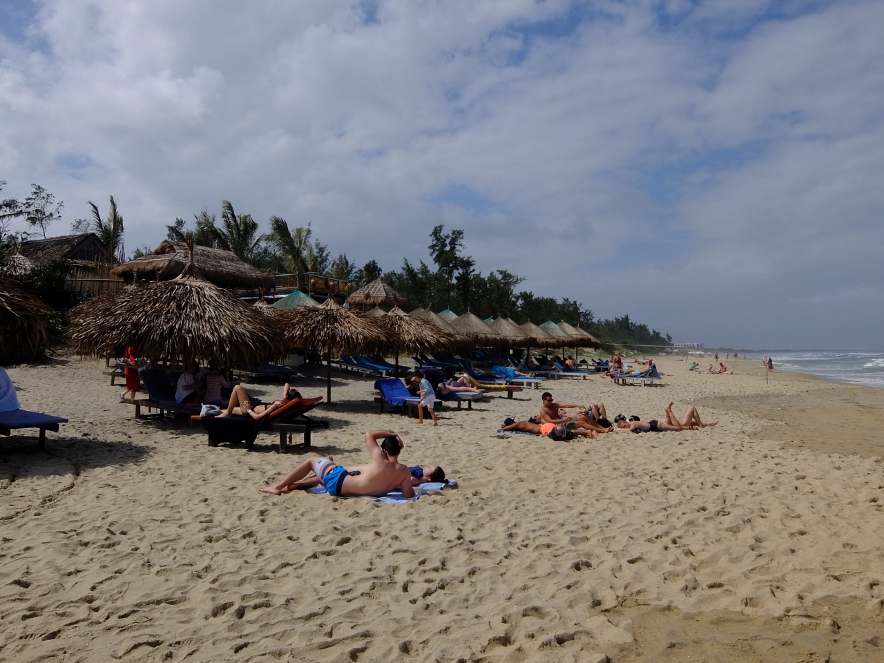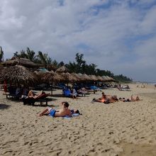 友人のバイクで連れて行ってもらいました。ホイアンの中心部から15分位でした。海の家的な店が並び、コーヒーやカクテル、軽食などがとれます。各店の前にはデッキチェアやパラソルがあり、利用できます。トイレも完備。ときどきフルーツ売りなどがまわってきます。