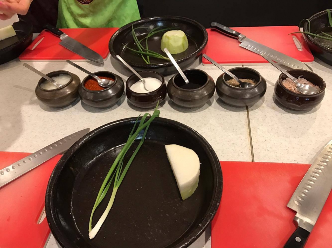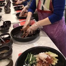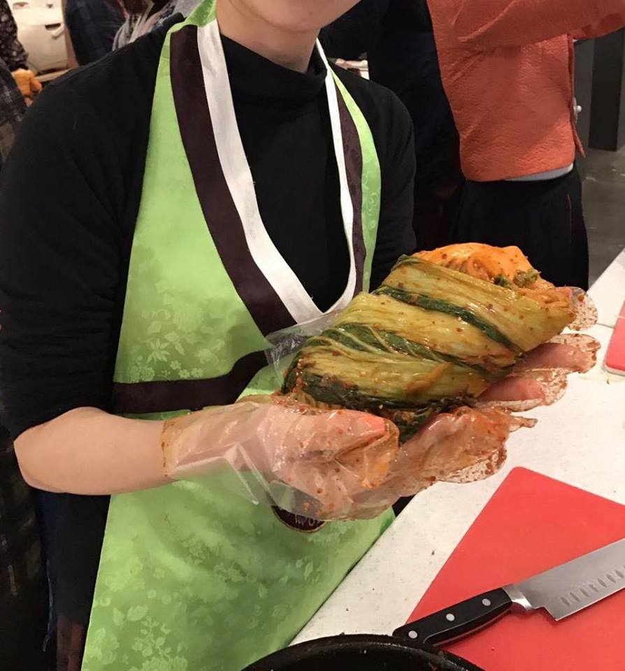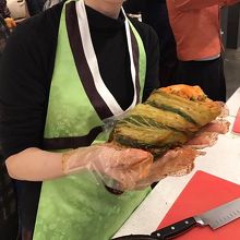 その後、韓服風エプロンに着替え、キムチ作りを開始。 私たちが参加した日は9割日本の方でお二人だけ香港からの方だったので、先生が日本語、英語、中国語でキムチ作りの説明をしてくれます。その都度質問もできるのでとてもわかりやすくキムチ作りを楽しめます。出来上がったキムチは真空パックにしてくれます。浅漬けが好きか、しっかり酸っぱくなったキムチが好きかお好みらしいので、まだ私は食べていませんが、一緒に行った友達は帰国してすぐ食べたそうで美味しかったと言っていました。 お家でも漬けてみるようです。