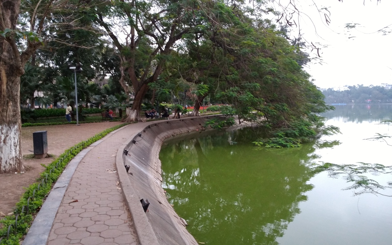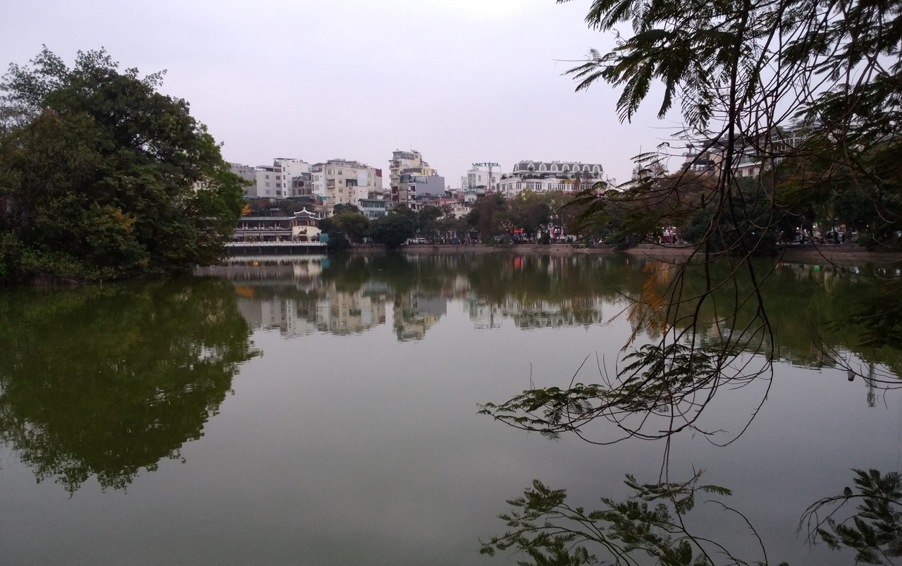 ハノイの印象は壮絶でした。バイクと車が次々来る、信号のない道をやっと渡り、湖畔につくと、ほっと出来ました。車のクラクションの音が絶えない道、歩道にもバイクが走ってきてクラクションを鳴らされる始末。ベビーカーゼロ、妊婦で歩いている人ゼロ、車椅子ゼロ、子供同士歩いているのもゼロ、そんな中この湖は心やすらぐ場所でした。その日は曇だったので景色が、幻想的で風情を増していました。