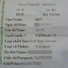 フェ駅からダナン駅まで列車で、6,400D (約320円)です。便数が少なく19:55発しかありません。
