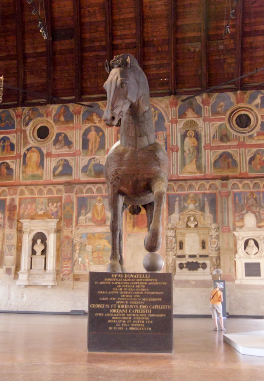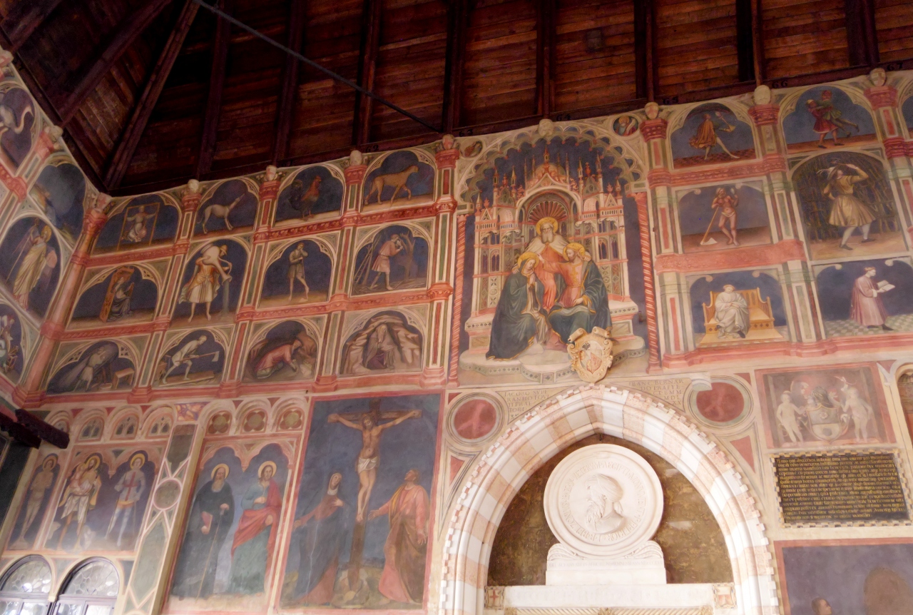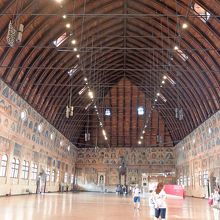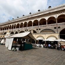 ラジョーネ宮はとても面白い建物だ.全体ではサロンで78×27m,高さ27mとすごい広さ.上はまるでひろい掘っ立て小屋のような屋根.その下にフレスコ画.占星,宗教,学芸,日々の仕事という15世紀の連作.なんともすごいたてものだ.むしろ私は外のバルコニーがなかなかすごいと思った.中世の自由都市の面目躍如というところか.