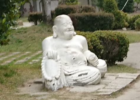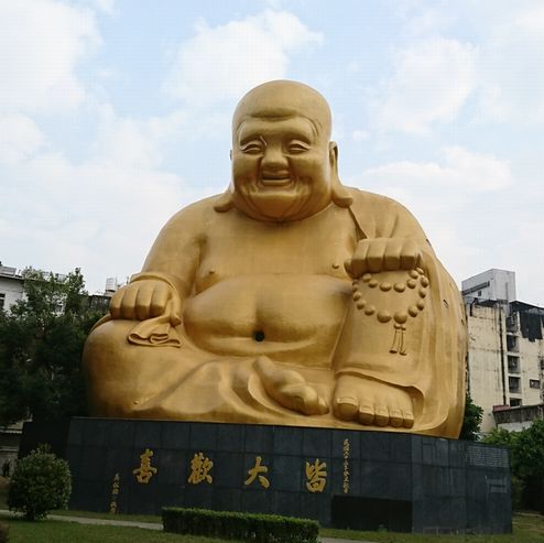 木造造りの本堂を石造りの本堂で覆っている変わった造りのお寺です。本堂左手には日本統治時代に台湾で亡くなられた日本人の方々の共同墓地があり、日本人が贈った大きな鐘「友愛鐘樓」もありました。本堂右手奥に進むと巨大な金色の大仏様が柔和な笑顔を湛えていて気持ちが和みます。手前の小さな大仏様のおへそを触るとへそくりが貯まり、頭をなでると頭がよくなるそうです。しっかりとなでてきました。