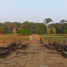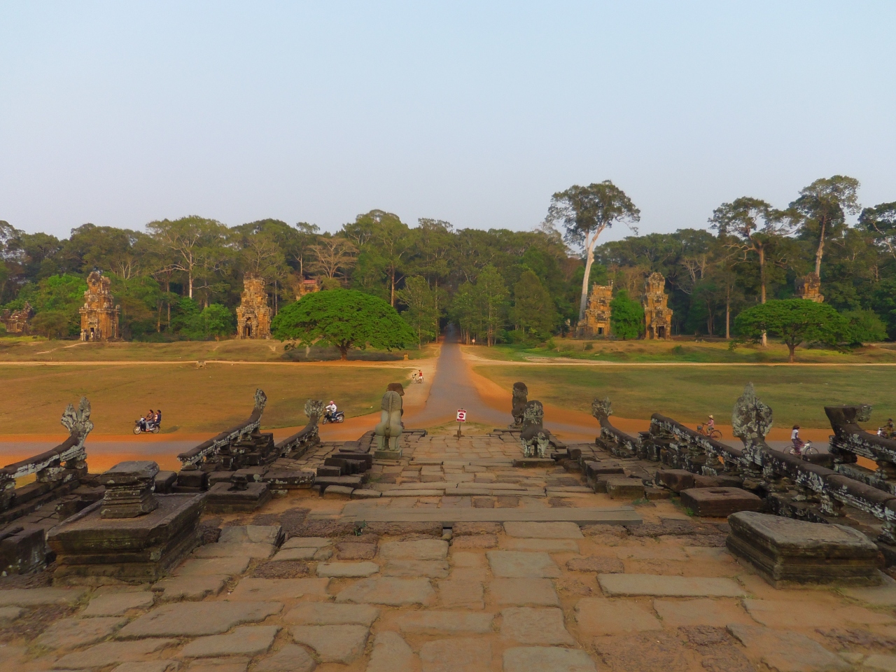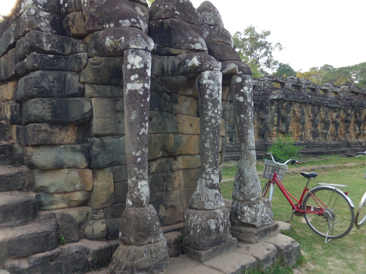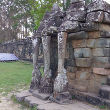 バイヨンを北に進むと象のテラスに出ます。蓮の花を摘む鼻を柱にした象が3頭。よく見ないと象に見えないくらいイメージしたものとは異なりました。そもそも12世紀末に造られているので原形をとどめているとは言えないと思います。雨ざらしですから。王のテラスが続いていてこのテラスから勝利の門を通って出兵する兵士を見送ったそうです。