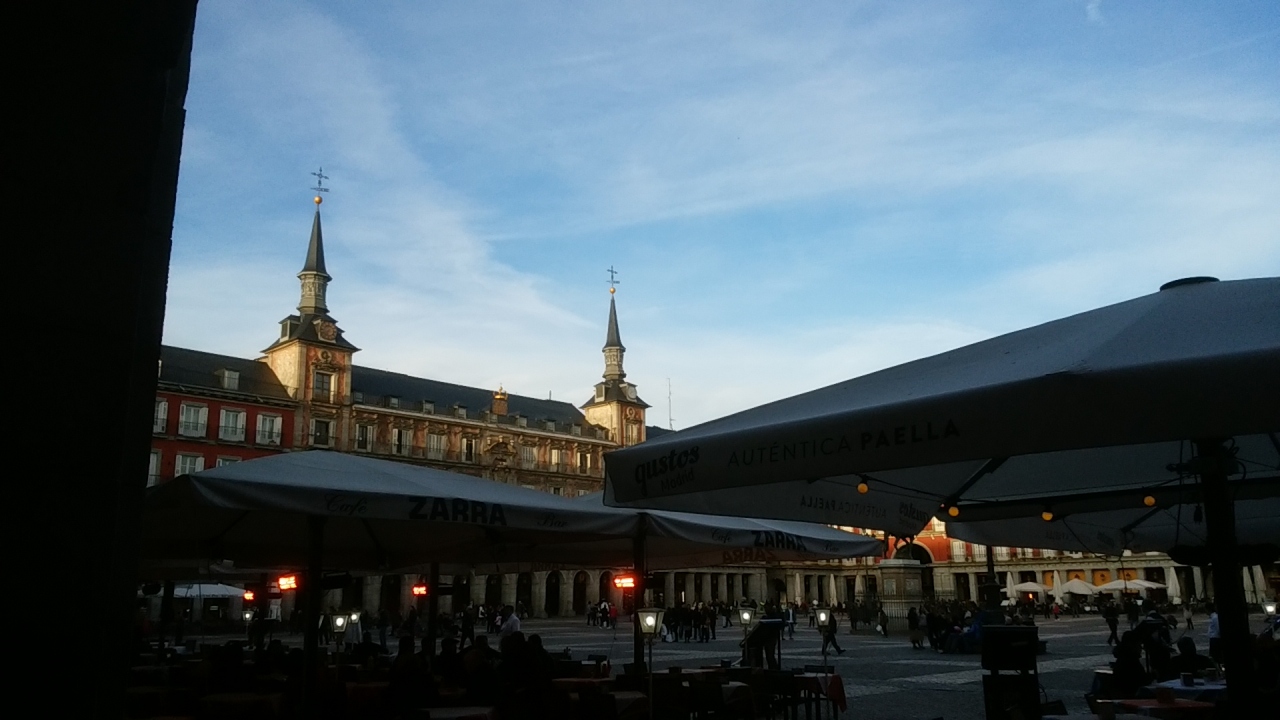プエルタ・デル・ソルとサン・ミゲル市場の間に位置する広場、マヨール通りから何か所かの入り口があり、周囲はブラッセルのグランプラスに比べれば低めに見える歴史を感じさせる建物で囲まれている。