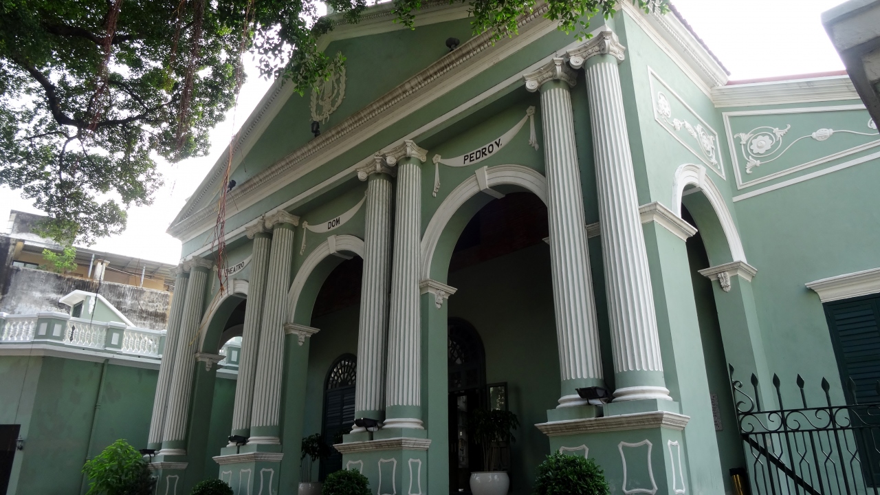 セナド広場前の民政総署ビルの右側の緩やかな坂道を5分ほど昇って行くと、聖オーガスティン教会の向かいに建つミントグリーン色の建物がドン・ペドロ5世劇場です。世界遺産マカオ歴史地区の構成物30個の内の1つです。