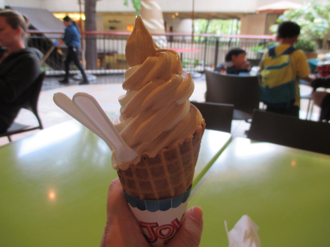 ロイヤルハワイアンセンターのフードコート内にあります。デザートのショップで、ケーキ、アイスなど色々あります。今回は、ソフトクリームを購入。ハワイアンツイストで、コナコーヒーとバニラのミックスソフト。香ばしいコーヒーと甘いバニラが丁度よく、非常においしくいただきました。