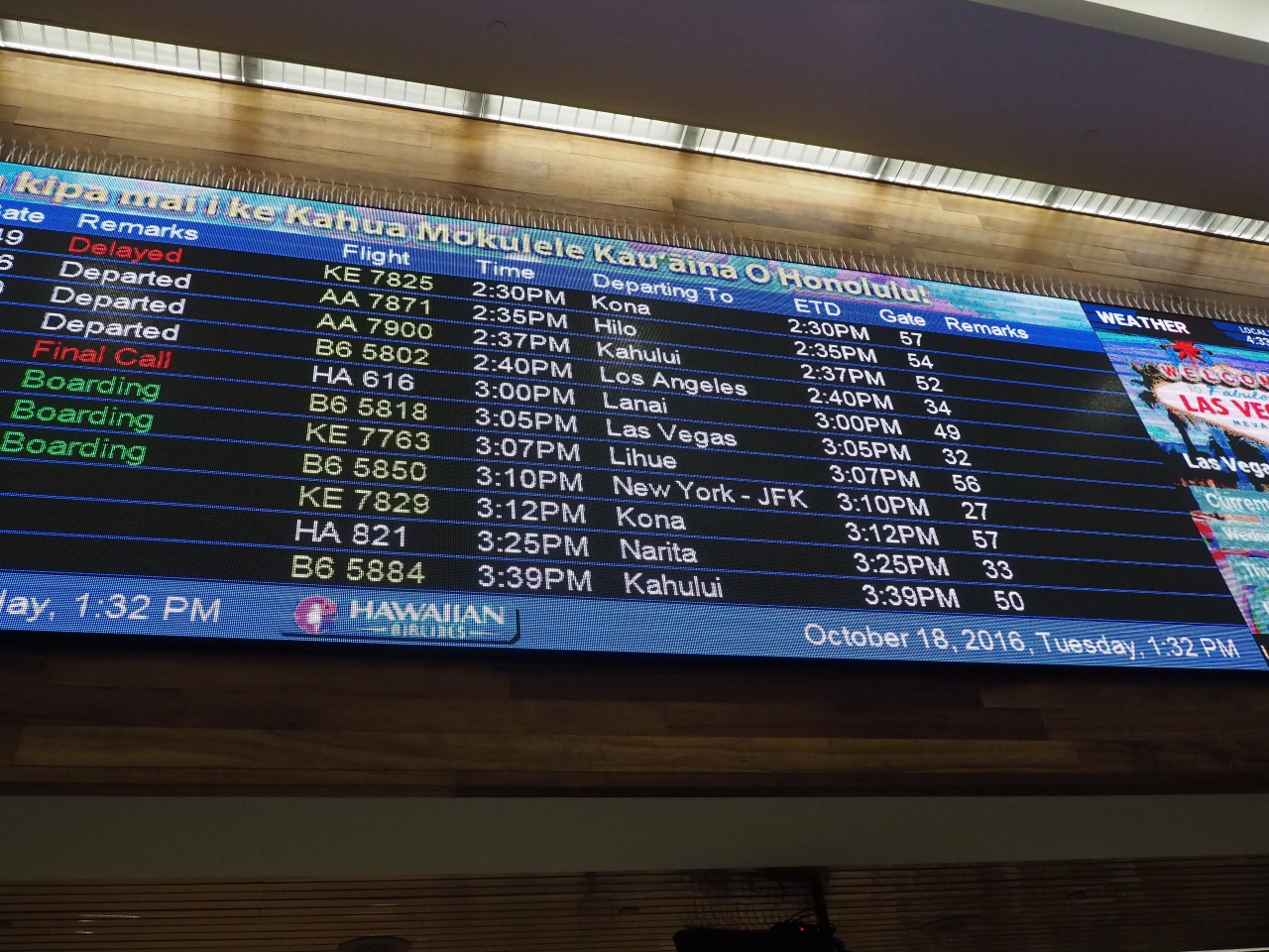 毎年のハワイ旅行で必ずお世話になる空港です。日本からの便はほとんど、日系の便は全部この空港です。ハワイでは随一の設備の充実した国際空港で航空会社のラウンジも多く時間を過ごすことができます。今回、マウイへの乗り換え時間が3時間あり助かりました。