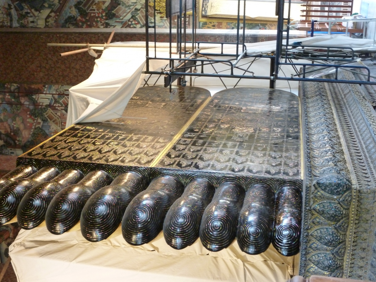 昨年行った時は修復中で足の裏がみれなかったので1年後行きましたがまだ修復中でした。でも、少し見えたところは韓国のアワビ細工のようにとてもきれいな仕上がりです。これが完成したらどれほど素晴らしいかと思いました。ワットポーは涅槃仏だけだと思われがちですが、意外と見応えがあります。舟からも近いので気軽に立ち寄れます。