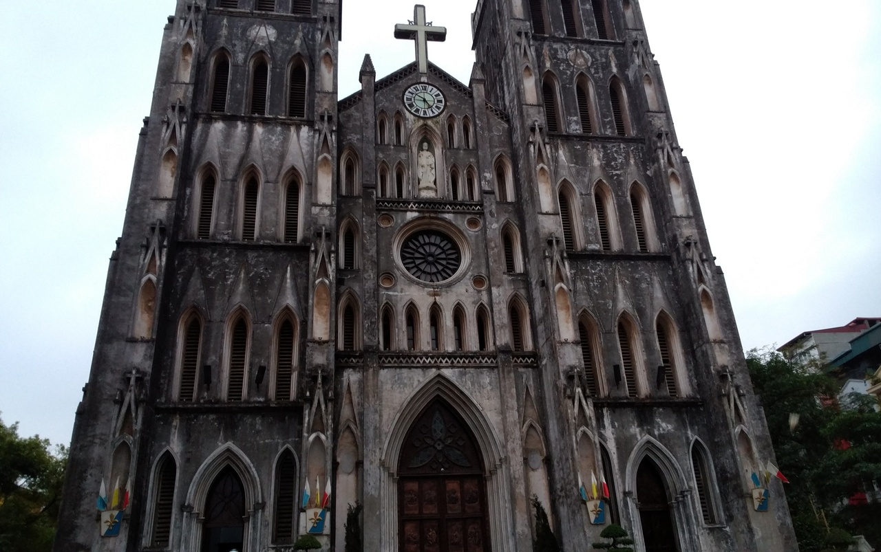 ホアンキエム湖の横の道を入って、食べ物屋さんや雑貨店の並ぶ中歩いていると大きな教会が見えてきます。前は広場になっていて、休んでいる人や写真を撮る人が多いです。町を歩いているといつの間にかここに着いてしまう事が何回か有りました。近くに安くて綺麗なスーパーもあり、町歩きの憩いの場所です。