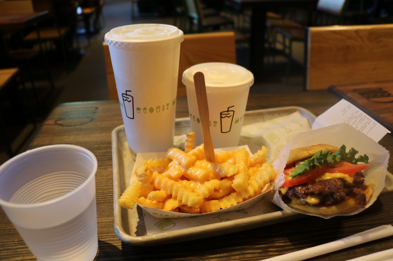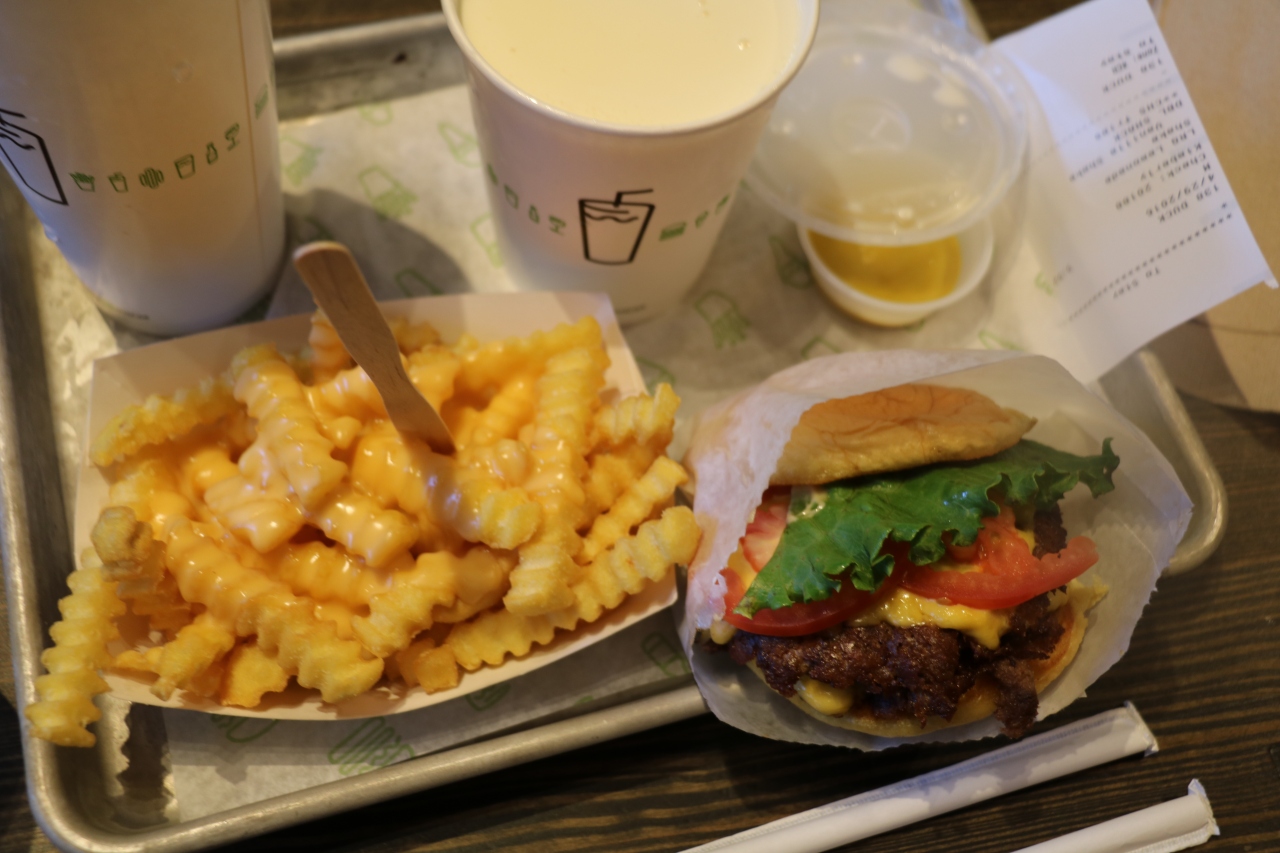 オーダーは「シャックバーガー」と「チーズフライ」にしました。ハンバーガー自体はアメリカにしては小さくて日本人向きかな。チーズのかかったフレンチフライとセットでいただくといいかも。