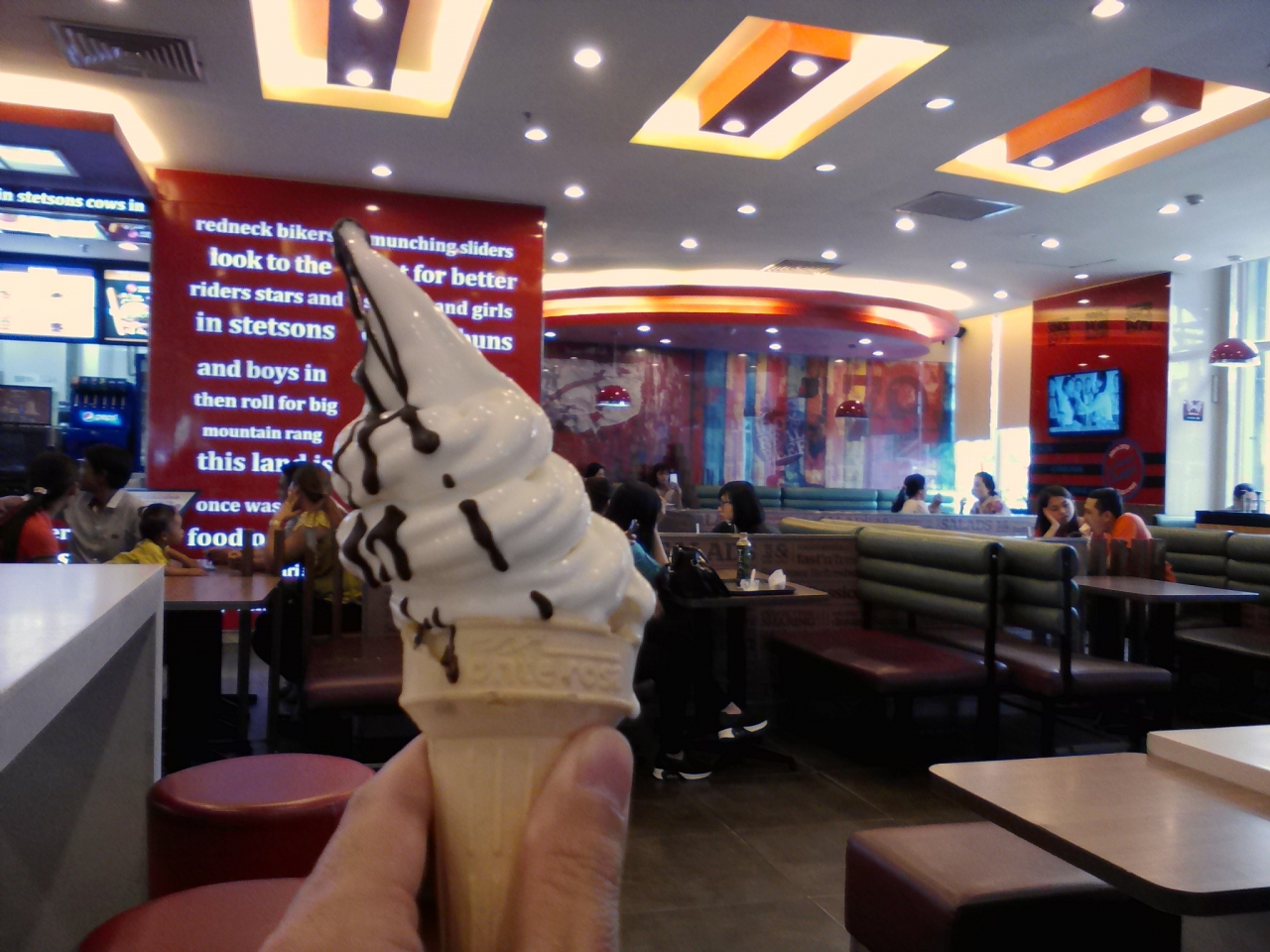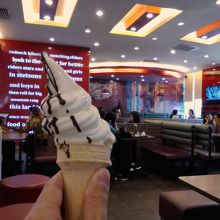 ハンバーガーではなくソフトクリームを食べに行きました。以前、同じフエ市内のチェーンティエン・プラザ(コープマート)内にある店舗で食べた時は5000ドンでしたが今回はなんと3000ドン。カウンターに置いてある古いメニューには5000ドンと書かれていたのでどうも値下げしたようです。サイズ的に変わったかは定かではありませんが安くなるにこしたことはありません。チョコがかけられ味もとってもおいしいです。Big-Cへの買い物がてらに立ち寄ってはいかがでしょうか。もちろんA/Cが効いてて涼めますし、Free Wifiが使えます。