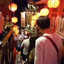 汽車路のバス停より豎崎路に入りました。細い道で石段になっています。この石段も幅が違っているのでちょっと歩きづらいです。通りには、ワンちゃんも寝ていたりして、蹴とばしそうになりました。石段を上っていくと、通り沿いに「千と千尋の神隠し」で有名な「阿妹茶楼」があります。赤い提灯が独特の雰囲気を醸し出していています。この辺りからはかなり混雑していますが、九分らしさを一番感じられる場所でした。