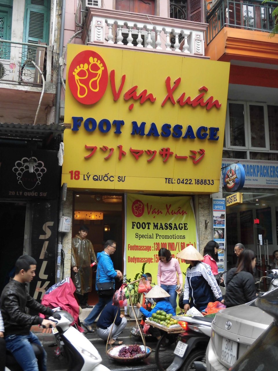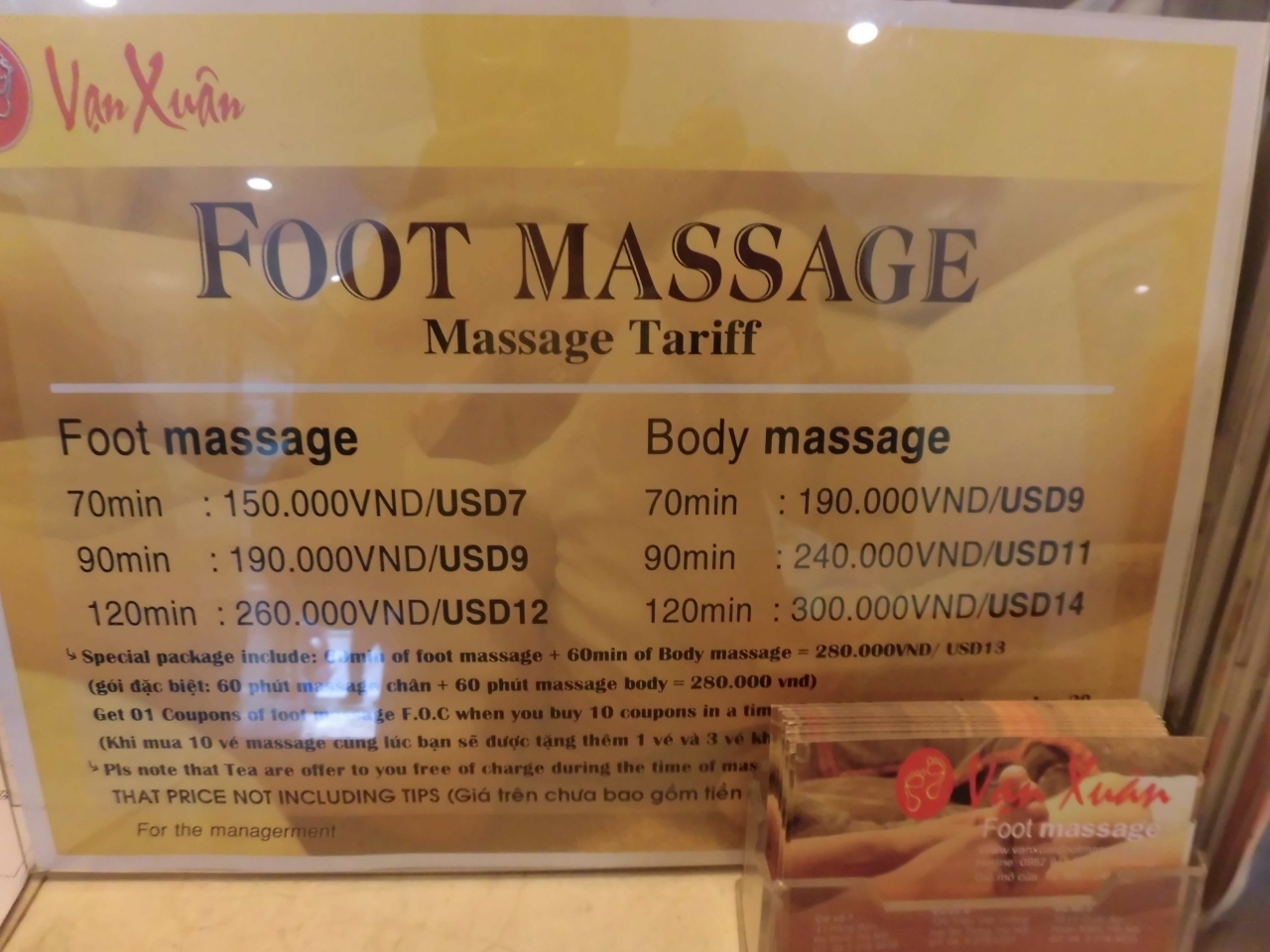33席ある大型のマッサージ店です。日曜日の午後からは予約をしないと満員です。午前中はすいていました。フットマッサージとボディマッサージがあり、時間もいろいろ選べます。今回はフットマッサージの70分(15万ドン+チップは6万ドン以上)をしました。ズボンを用意された短パンにトイレで着替え、足湯の間に頭、肩、背中、手のマッサージがあります。その後、足全体のマッサージ(約50分)です。最後にうつぶせになって、腰と背中のマッサージでした。室内は明るく小奇麗でした。マッサージは全体的に力が弱めに思いました。サービスでお茶があります。