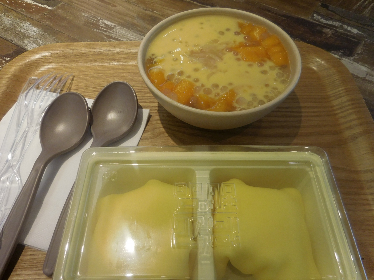 店内リニューアルされてキレイになってました。15時頃に行きましたがガラガラでした。冬だったので温かいスイーツが店内アピールされてましたが、定番のマンゴクレープと楊枝甘露を指差し注文。マンゴクレープはプラスティックのケースに入っているのでテイクアウトにもよさそうです。