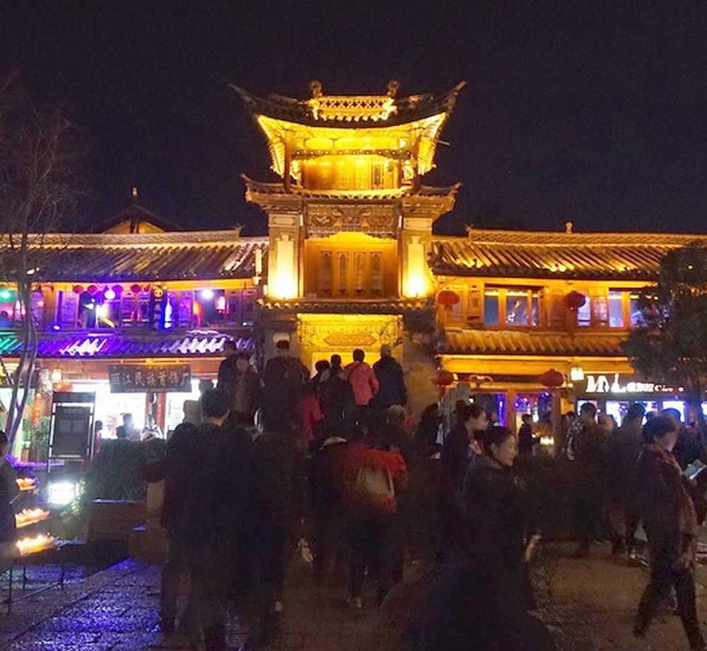 2017年2月末に古城内の宿に3泊し、夜と昼一日かけて見て回りました。夜は軒を連ねる店のライトアップで華やかな雰囲気をかもしだし、四方街近辺のレストランがライブハウスに変わり、大音響で観光客の関心を引いている様は異様ともいえる程で、古都のイメージとは大違いでした。朝は石畳を水路の水で洗い清め、ごみ一つない状態を維持することに努めている住民たちを見かける機会も得ました。昼は夜とは打って変わって落ち着いた古都の雰囲気が漂っており、フラワータウンと言われるように、街中に春の花が飾られてきれいでした。高台から望んだ瓦屋根の波も素晴らしく、必見です。晴れた日には町の背後に玉龍雪山が高く聳え、素晴らしい古都の風景を形作っていました。なお、観光客は町に入るときに維持費(80元)を払うことを忘れないように。私達は玉泉公園を見学する前と、再び古城内に入り水車から四方街に向かうときに、支払った領収書の提示を求められました。