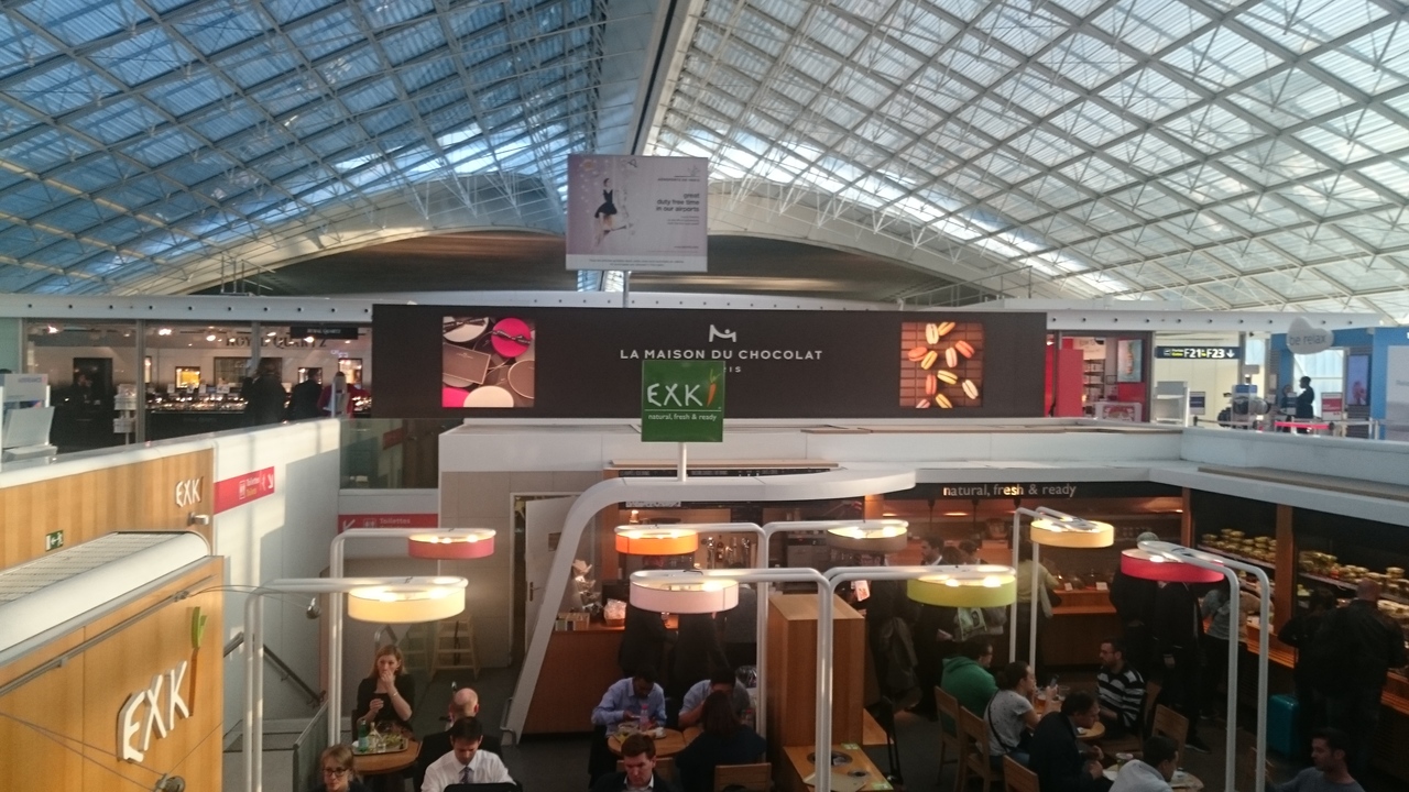 エールフランスを中心に欧州域内線が発着する2Fにあるカフェ。CDGはターミナルが分散しているので、大きなレストランが少ないためか結構混雑。2Fダミーミナルの20~30番代の搭乗口のロビー中央の階段で下がった場所にあり、荷物があると入りにくい。サラダや温かいキッシュ、キャロットスープ等がメイン。キッシュは、さすが美食の国、フランスだけあって手を抜いていない味。ビールも飲めるのでちょっとした軽食にはぴったりてす。
