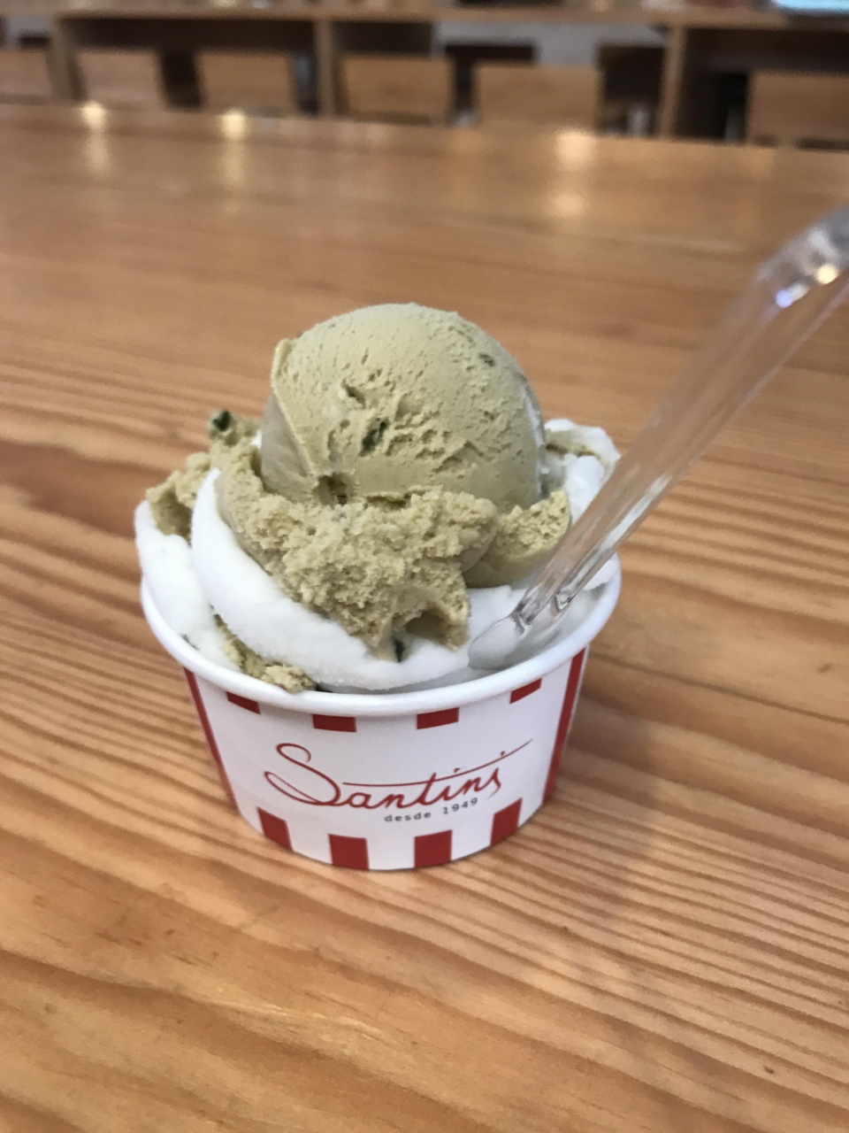 リスボンでおいしいアイスということで、寄ってみましたが、とてもおいしかったです。2.9ユーロでカップかコーンか選び、2種類選びます。私は、ピスタチオとレモンにしましたが、ピスタチオが特においしかったです。つぶつぶしてました。レモンはまんまレモンという感じで酸っぱいっ。私が当たった人が悪かったのか、2種類が混ぜってる場所が多くて、別に食べたい種類なので、食べるのに苦労はしました。