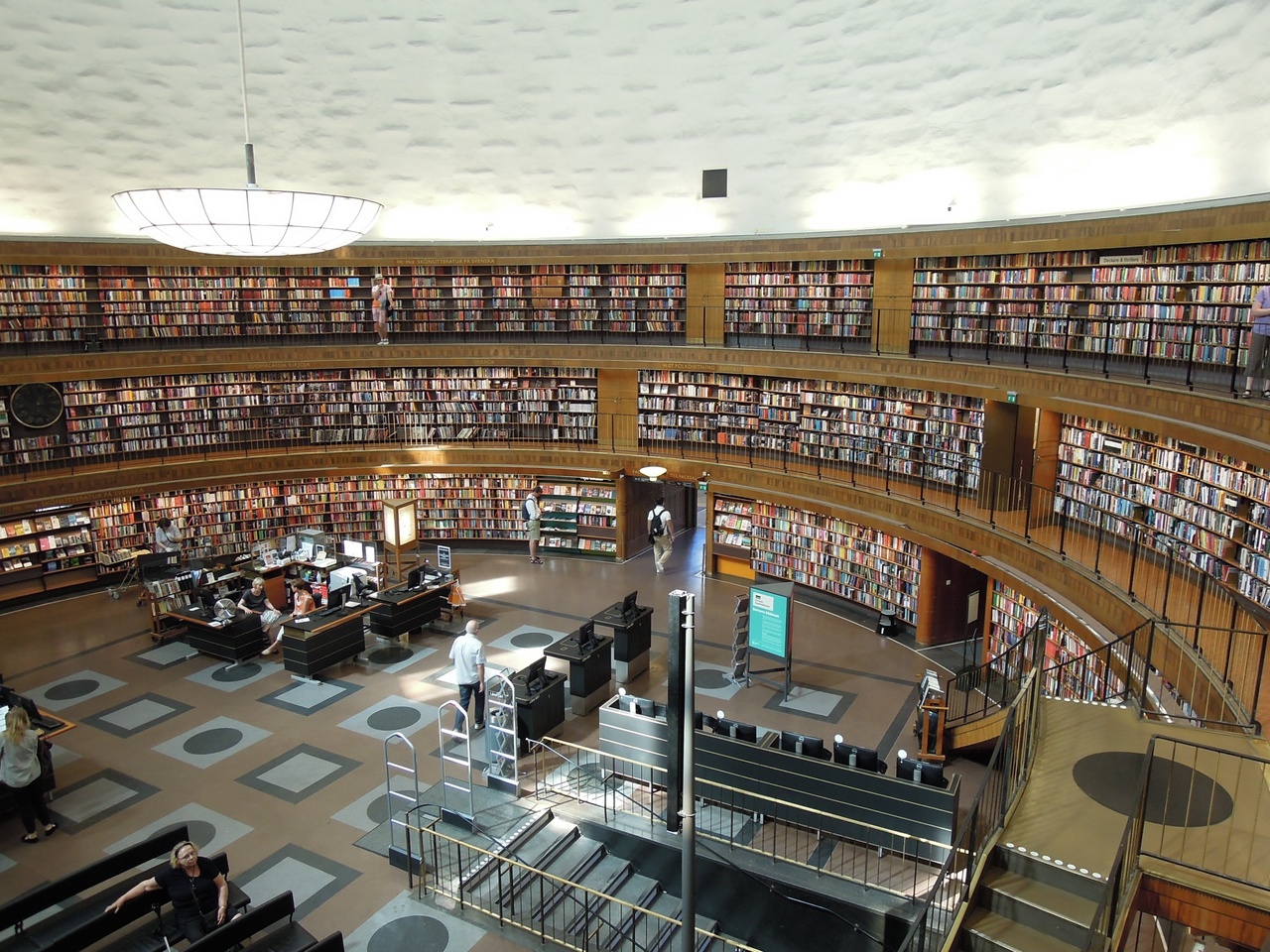 地下鉄グリーンラインに乗り、Radmansgatan駅で降ります。図書館は360°本に囲まれた円形の空間で、壁一面が本で埋め尽くされていてかなり迫力がありました。設計は「スウェーデンの建築の父」とも呼ばれるエリック・グンナー・アスプルンドです。日本のマンガも置いてありました。