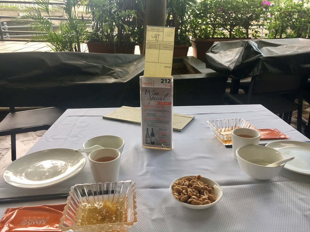 「時価」が怖く、ぼられてもどうしようもないので、日本よりJCBカードのプラン(70シンガポール$)のコース料理をいただきました。