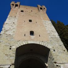 市街地から少し離れたサンタンジェロ教会へ向かうゆるくカーブする道の途中から、立派な城門が見えてきます。サンタンジェロ教会方面の小道に行かずにまっすぐ行くと城門です。屋上部の形がいかにも城門らしくて良いと思いました。門をくぐると住宅街です。