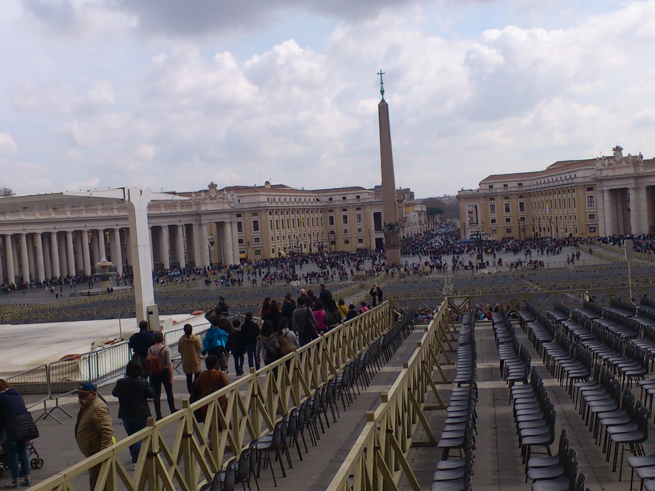 地下鉄の駅からバチカン美術館へ行くはずが、曲がるのを忘れてそのまま真っ直ぐ進んで行ったら、サン ピエトロ大聖堂の前のサン ピエトロ広場に出ました。まだ朝早い時間なのに、とんでもない長さの行列ができていました。広場の真ん中にはオベリスクがあります。サン ピエトロ大聖堂を見学した後に、上の方からこの広場を眺めると、法王になったような気分でした。