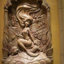 上海ディズニーのお城の特徴は、すべてのディズニープリンセスが集うお城との事で、城の中を巡るアトラクションに入ってみた。上り階段の途中には、その通りすべてのプリンセスの像が展示されている。その後は、白雪姫に始まり色々な物語の紹介コーナーを巡る。白雪姫のお顔が、なぜか中国風に見えた。