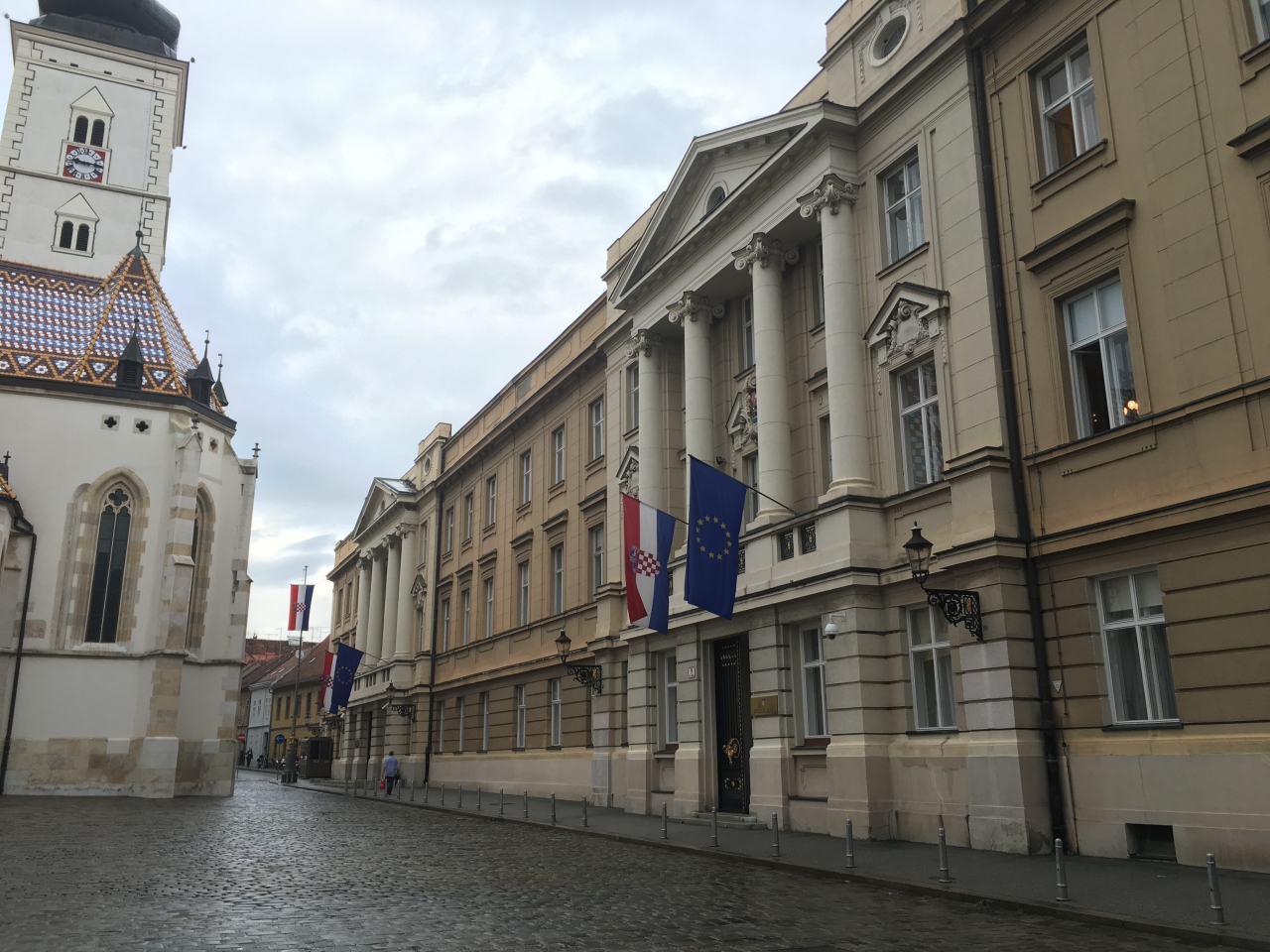 聖マルコ教会の隣にあるギリシャの神殿のような柱の見かけの建物がクロアチアの国会議事堂です。入口にはクロアチアの国旗の他にEUの旗も掲げられており、以前訪れた時にはEUに加盟していなかったので一人で勝手に感慨深い気持ちになりました。閉会中なのか残念ながら中には入れず入口での記念撮影だけでしたが、個人的には勝手に盛り上がってしまいました。立派な建物なので、ふらふらと歩きながら外観を楽しむ程度で見るのが良いと思います。