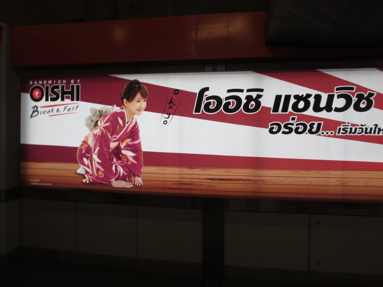 BTSの駅構内を歩いていると種々の広告看板を見かけます。モーチット駅の改札口を入ると親日らしい日本の文字とおもしろい宣伝がありました。日本で販売されているフレッシュなサンドイッチに関する広告で、日本にはないセンスと珍しい看板で思わず撮影をしていまいた。