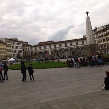 名前の通り、フィレンツェの駅前の有名なサンタマリアノヴェッラ教会の正面前に広がる広場です。サンタマリアノヴェッラ教会はフィレンツェ駅の方から見ると茶色い地味な教会のように見えますが、駅から反対側に回り込んで正面を見ると別の顔をしています。周りには多くのカフェがあり、そこから教会の美しい正面を見ながらお茶をして和んでいる人がたくさんいました。