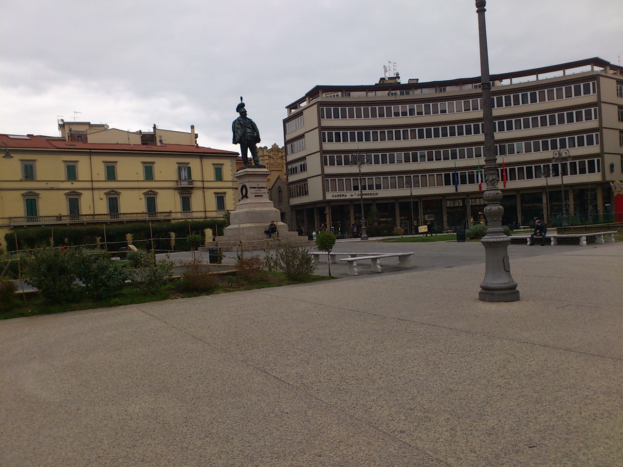 ピザ中央駅を降りて、ピザの斜塔まで歩いて行きました。駅前の大通りを少し進むと、このロータリー広場に出ます。広場の中央にはヴィットーリオ エマヌエーレll世の銅像が建っています。ちょっと小太りで背の低い銅像で、あまり偉そうな感じがしません。ピザの斜塔はまだまだこの先です。