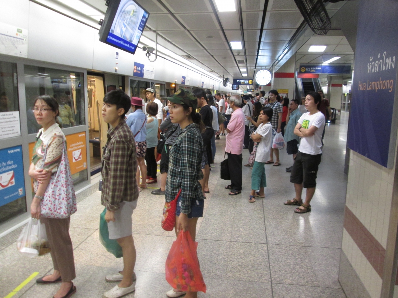 ファランポーン駅では地下鉄が到着してもすぐには乗車できません。ホーム上にいる係員が到着後に車内検査を行い、1、2分間待機する必要があります。バンコク市民の方も分からないようですぐに乗り込むことがありますが、到着してすぐに乗り込むと注意されます。