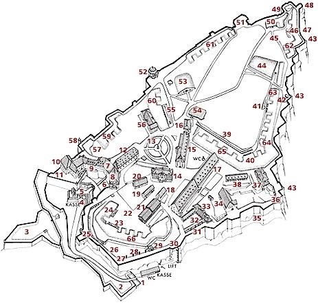 ①見張りの塔(1601、1600年)、②兵営、③29エレベーター、④突出した岩壁角、⑤クラニッヒ台地、⑥世紀から使用されたパン工房、⑦旧武器庫(1594年)、⑧Koenigsnase“王の鼻”と呼ばれる東に突き出た岩壁角、⑨雷痕の高台(300年もの歳古びた樫の木にしばしば雷が落ちたという。)、