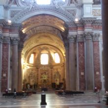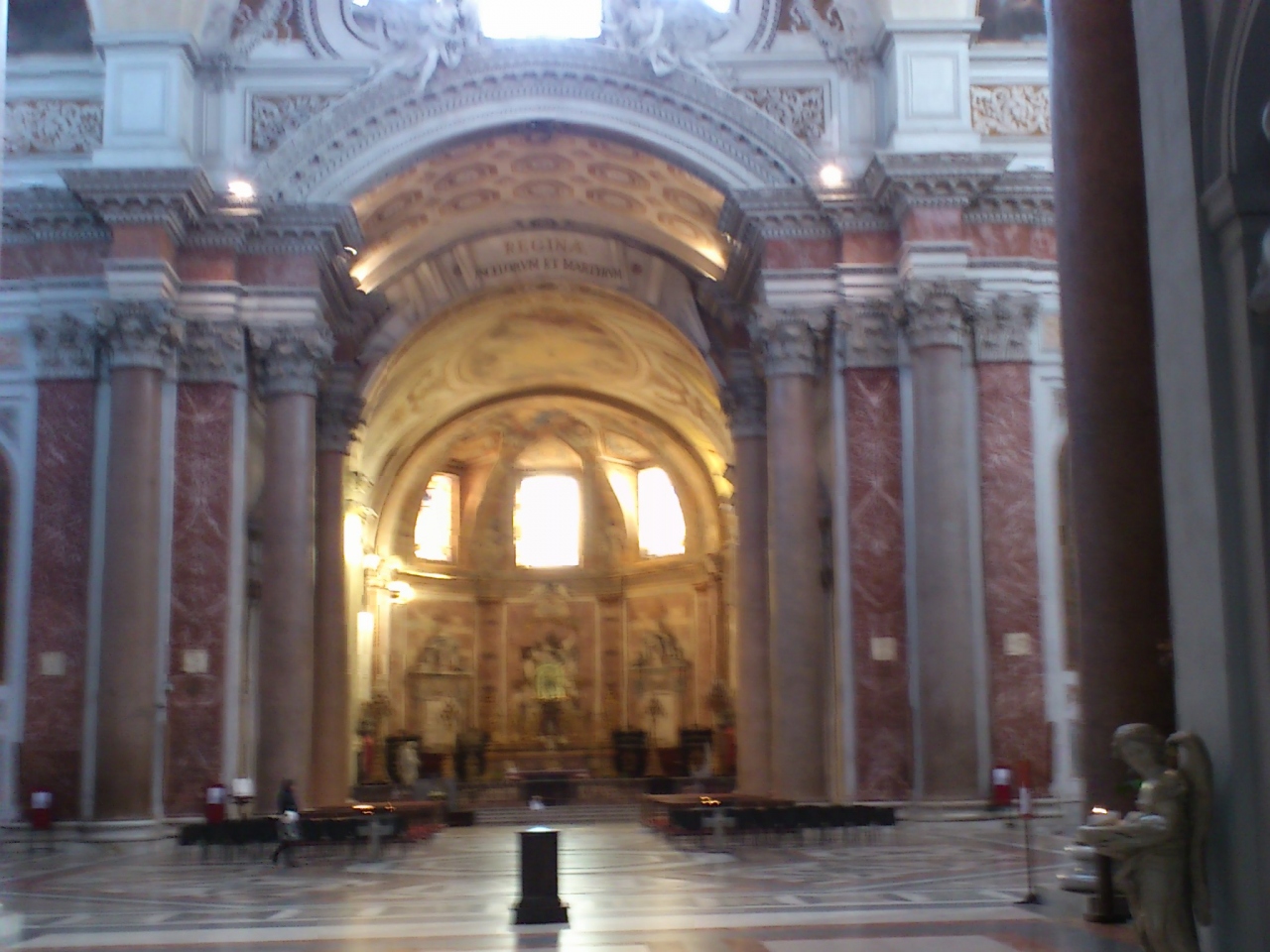 ローマ中央駅のテルミニ駅から歩いてすぐの場所に共和国広場という噴水のあるロータリーがあります。その脇にディオクレティアヌス帝の浴場跡があって、そこにこのサンタ マリア デッリ アンジェリ教会があります。外観は赤いレンガ作りで質素というか、かなり傷んだ感じがしますが内部に入って見るとびっくりするほど優雅な雰囲気です。