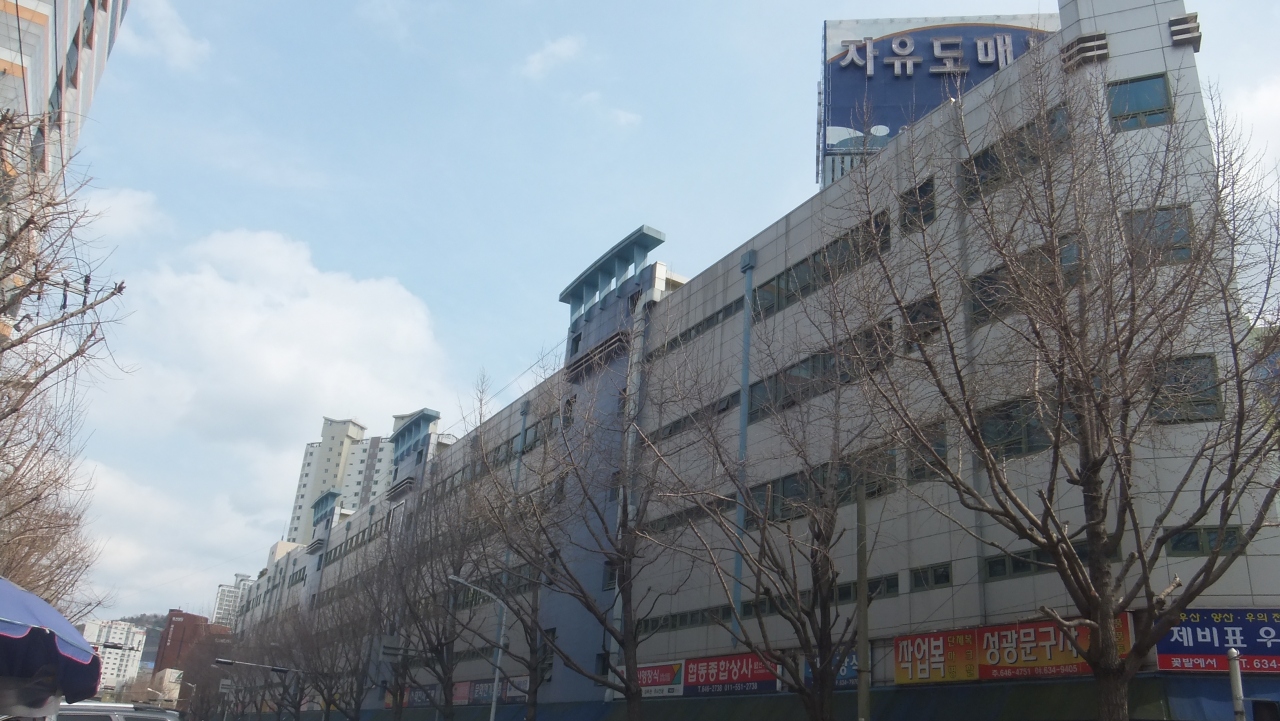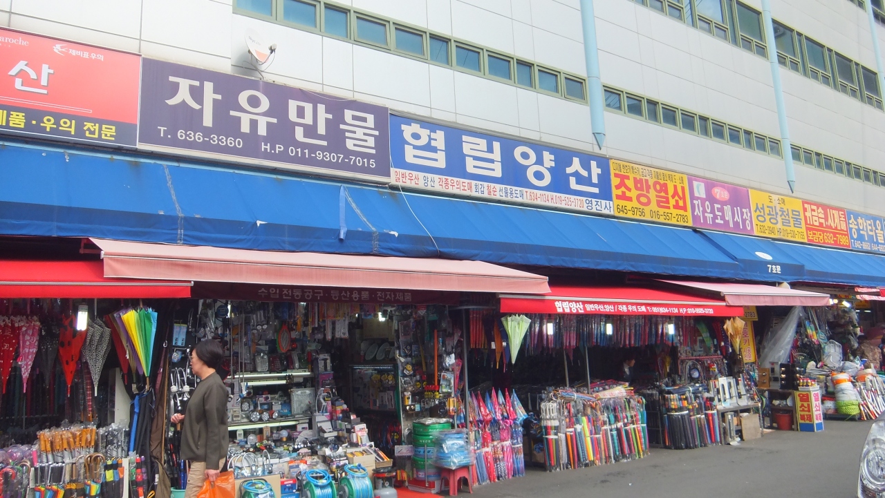 問屋街と言われる凡一洞にある市場の一つ。自由市場は衣類や靴や雑貨の卸売店がたくさん入っています。