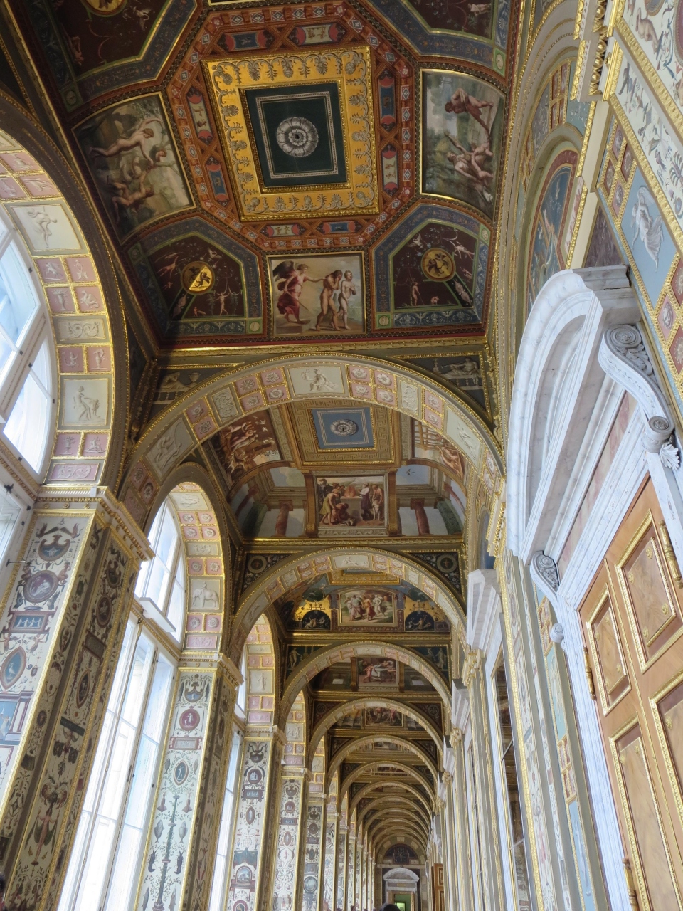 ラファエロの回廊では、ラファエロがバチカンのために描いたフレスコ画が模写されていて、壁、天井など、ぎっしりとフレスコ画で埋まっています。