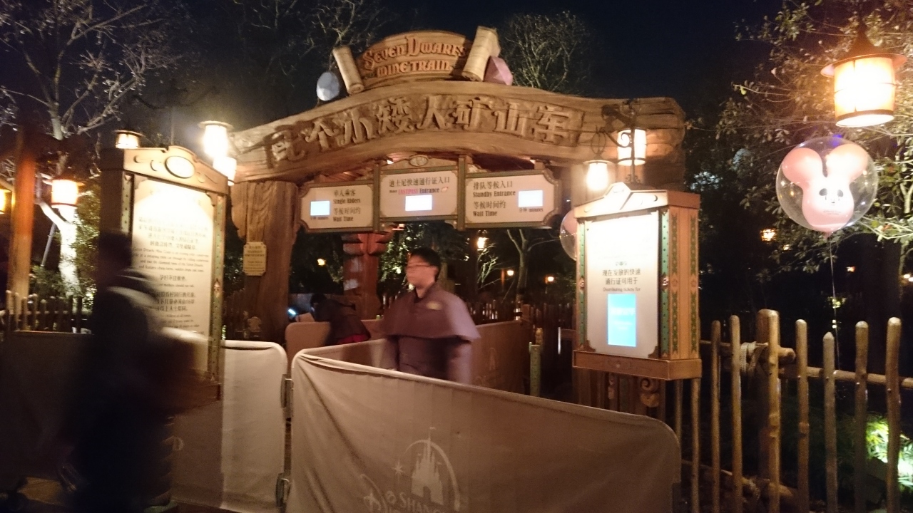 午後に取ったファストパスの乗車時間は「19:00至20:00」と閉園間際になっていたので、こんな時間ならファストパスがなくてもそんなに待ち時間はないだろうと行ったら、表示の待ち時間は50分。