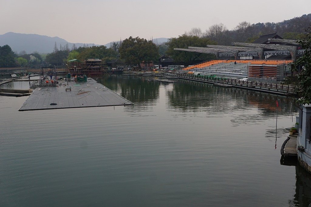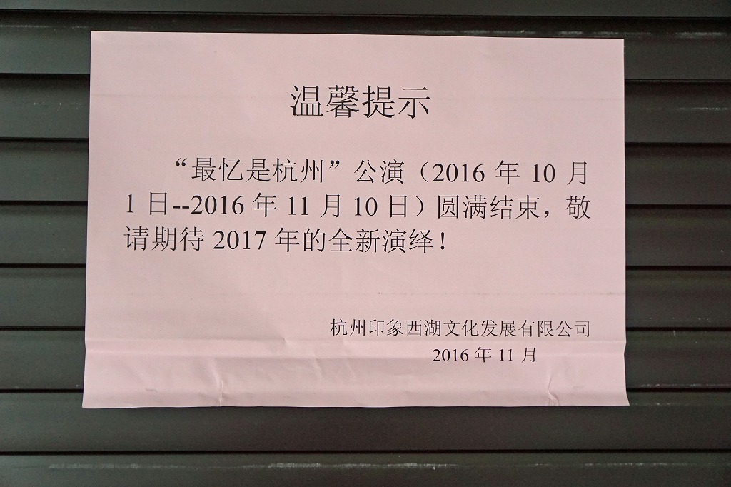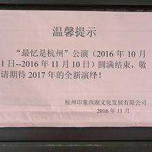 2017年3月上旬に杭州に行く機会があり、以前から観たかった「印象西湖」のチケットを手配しましたが、改修工事中で休演していました。岳廟の前にチケット売り場と入口があるので行ってみましたが、チケット売り場はシャッターが閉められ張り紙がしてありました。「2016年の10月から11月の公演が無事に終わり、2017年の清明節まで休演します。」とありました。地元の方に聞くと宋城の「宋城千古情」が人気があるので内容の見直しとステージの改修とを同時に行っているそうです。具体的な日時が書かれてありませんでしたが、清明節からとあったので4月4日頃には再演開始するのではと思います。