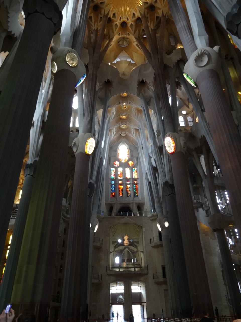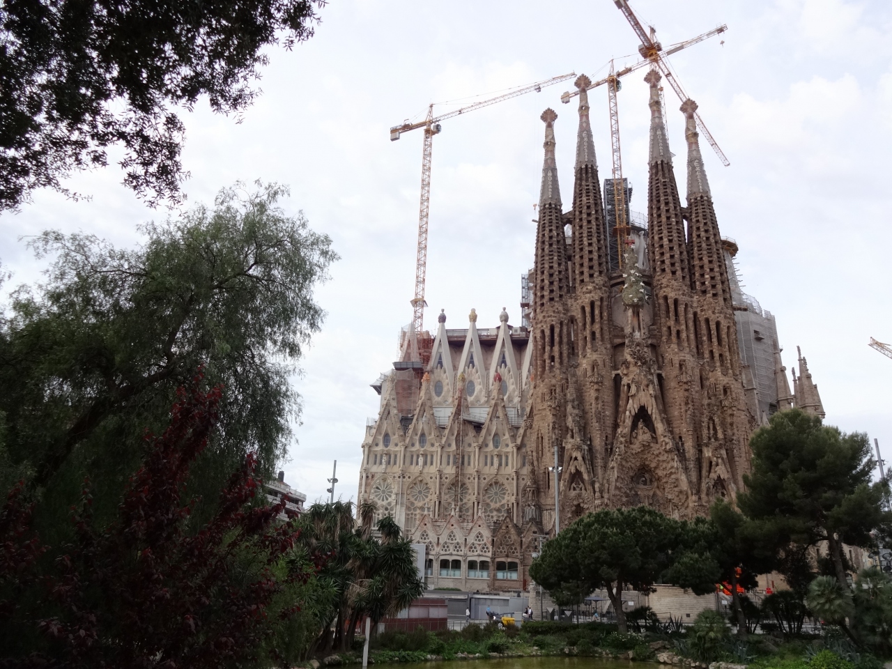 予約30分前には到着。先ずは外周一周、池を挟んで撮影。入口が分からなかったので。警備員に聞いくが、聞いた人により言うことが違う。そうこうしているうちに、5-10分前にGateが開設されセキュリティチェック。日本人も結構多い。この大聖堂は、聖母マリアの夫ヨセフに帰依する「サン・ホセ帰依者協会」の本堂として、1882年に着工。その翌年に初代建築家ビリャールが辞任すると、弱冠31歳のガウディがあとを引き継ぎ、1926年に亡くなるまで43年間の人生をすべてこの大聖堂に費やしたのだそうだ。着工から120年以上経つ現在も建設が続けられており、最終的には合計18本の塔がそびえる予定で、ガウディが完成させたのは、東側の「御生誕の正面」とその4本の鐘楼。内戦によってかなりの損傷を受けていたが、日本人彫刻家、外尾悦郎氏らによって修復されたとのこと。TV等で何回も見ていたのでそれ程の感動は沸かなかったが、それでも圧巻だった。