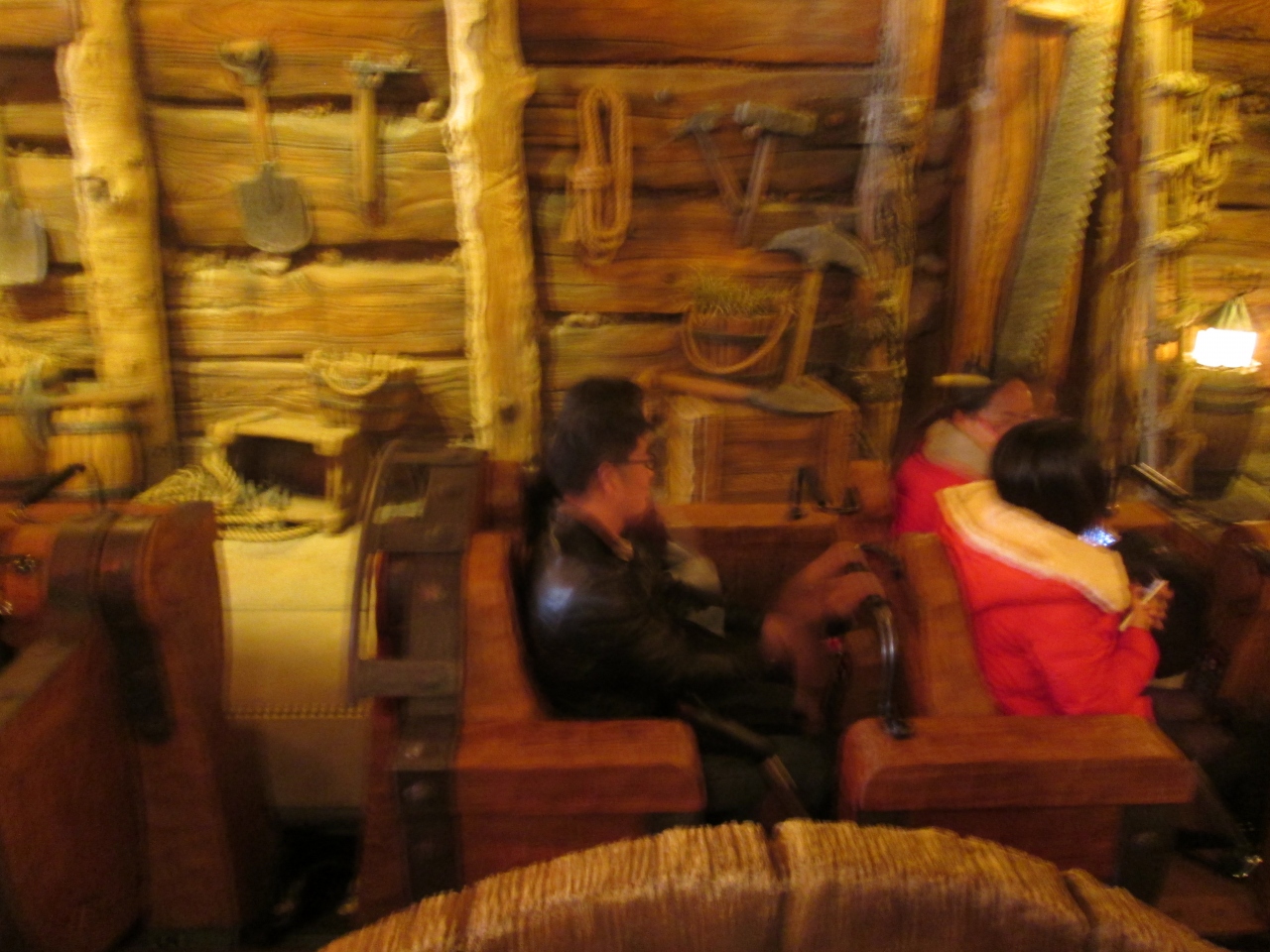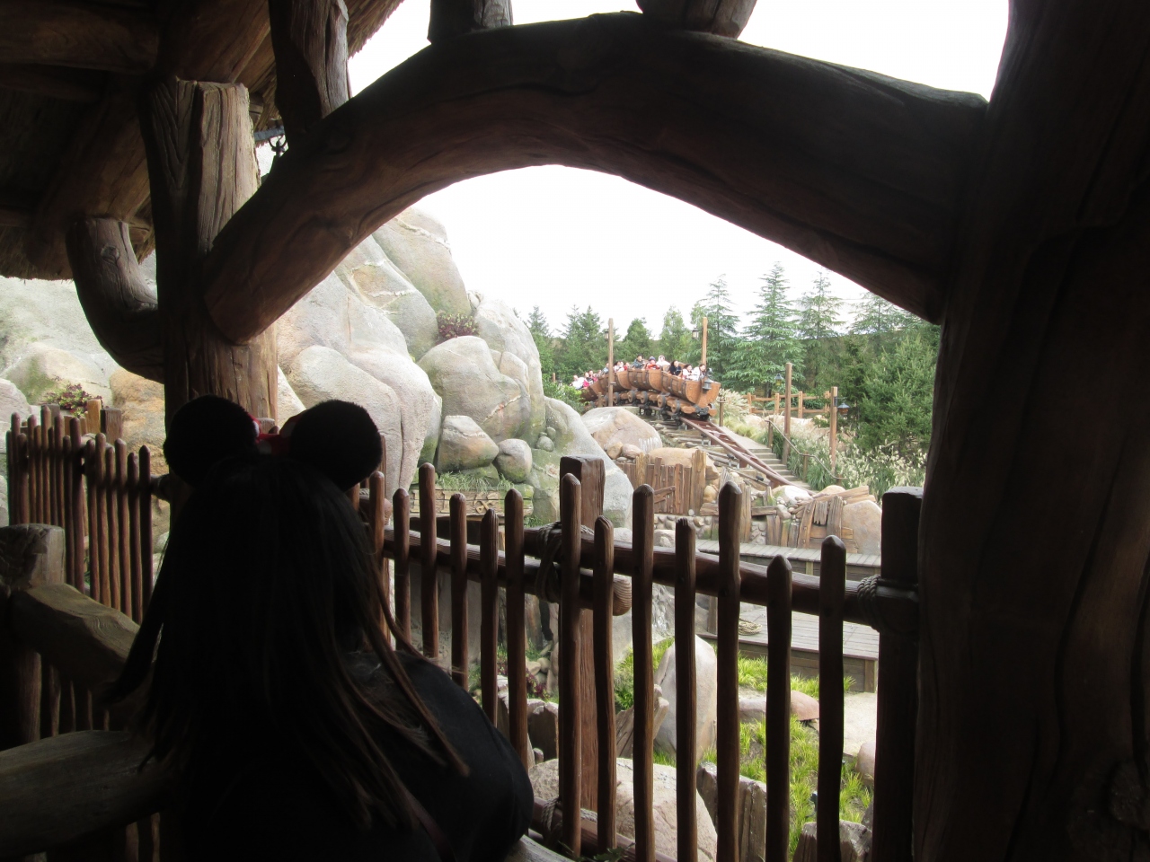 七人の小人のマイントレインの入口は1カ所で、向かって左がファストパス対応、右がスタンバイのレーンでした。左側はスタッフによるファストパスのチケットを確認していたので躊躇しましたが、シングルライドのレーンも兼ねていました。有効に活用できず、1時間程度並びました。